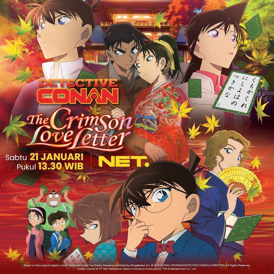 Sebelumnya sempat movie Sunflower Of Inferno dan The Darkest Nightmare telah ditayangkan NET pada momen Tahun Baru 2023 lalu. Kini menyambut Tahun Baru Imlek Imlek 2574/2023, NET dilaporkan berencana akan menayangkan movie Conan ke-21 dan 22, yakni Crimson Love Letter dan Zero The Enforcer, masing-masing pada hari Sabtu tanggal 21 Januari 2023, pukul 13.00 WIB, dan Minggu tanggal 22 Januari 2023, pukul 13.00 WIB. Pihak NET sendiri juga belum membuat pernyataan apapun hingga sekarang. Kini melalui media sosialnya, NET mengonfirmasi memang akan menayangkan movie Detektif Conan: Crimson Love Letter pada hari Sabtu, 21 Januari 2023. Namun jam penayangannya adalah pukul 13.30 WIB.