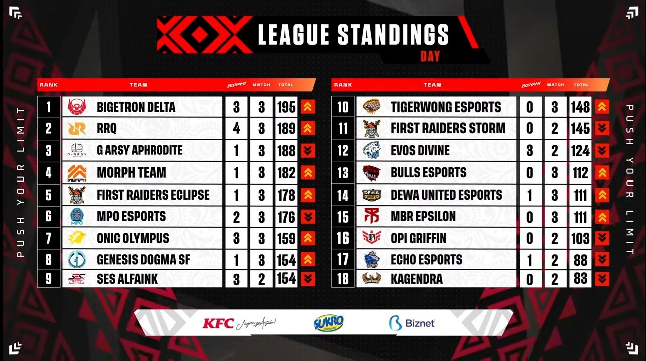 Hasil dari klasemen sementara di week 2 match 4 ini, posisi puncak dikuasai oleh Bigetron Delta dengan 195 poin yang mendapatkan 1 Booyah! dan bisa mengambil kesempatan dari tidak bermainnya SES Alfaink di match ini. Sedangkan RRQ berada di posisi kedua dengan selisih total 6 point dari Bigetron Delta dan G-Arsy Aphrodite harus berpuas di match kali ini di posisi ketiga dengan selisihnya sangat tipis 1 poin dari RRQ.