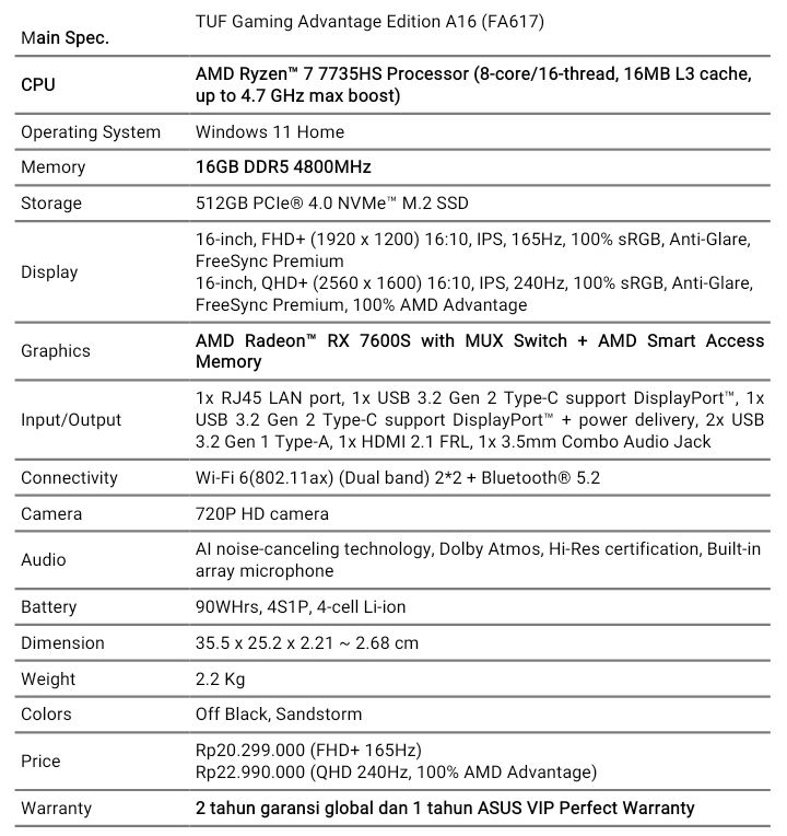 ASUS TUF Gaming A16 Advantage Edition akan hadir di Indonesia pada tanggal 16 Maret 2023 dengan harga Rp 20.299.000 untuk varian layar FHD+ 165Hz dan Rp 22.990.000 untuk varian QHD 240Hz dan 100% AMD Advantage.