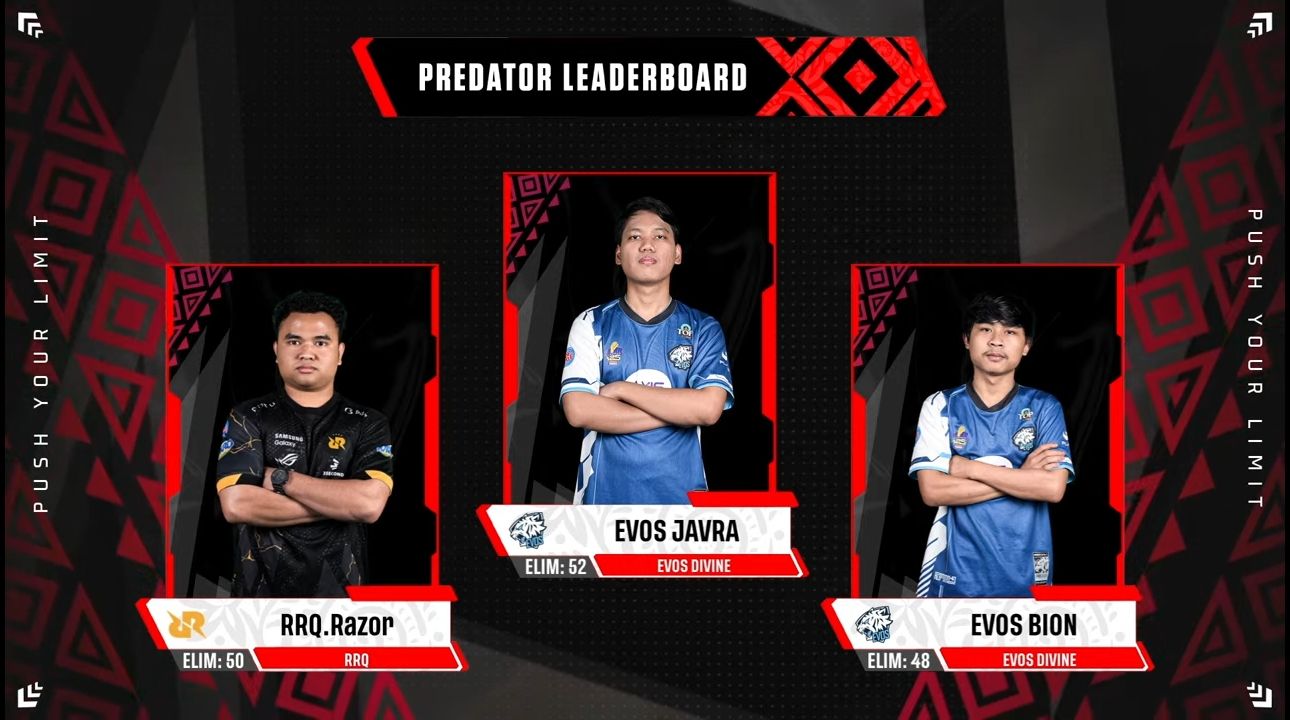 Untuk perolehan top predator FFML Season 7 kali ini masih dipegang oleh EVOS Javra. Lali ini untuk posisi keduanya yang awalnya milik EVOS Bion harus tergeser oleh RRQ.Razor dengan total eliminasi sebanyak 50 kill.