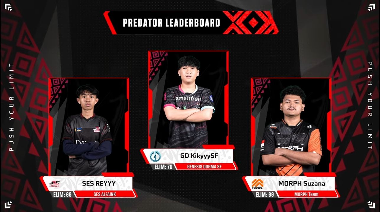 Untuk perolehan Top Predator FFML Season 7 di match ke-11 berhasil didapatkan oleh seorang GD KikyyySF dengan total eliminasi sebanyak 70 kill dan disusul oleh dua pemain yang mempunyai sama-sama memiliki poin eliminasi sebanayak 69 kill di posisi kedua dan ketiga, GD KikyyySF yaitu SES REYYY.