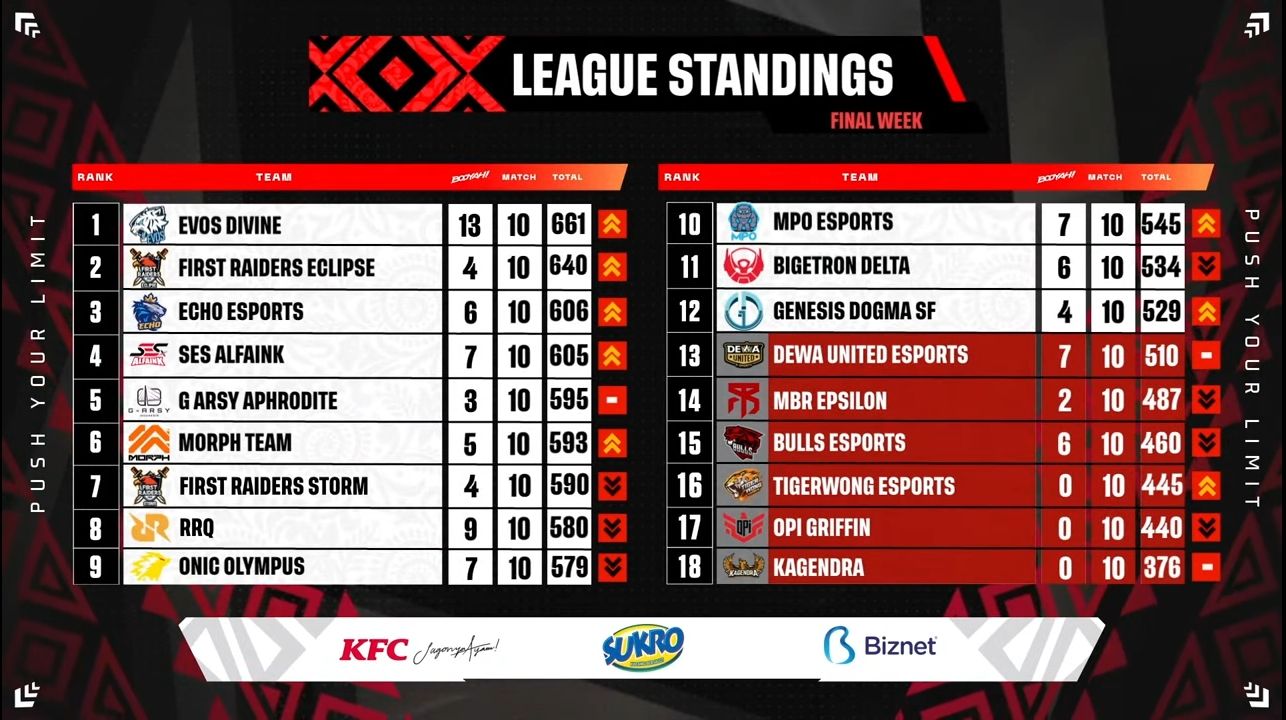 Dewa United, MBR Epsilon, dan Bulls Esports harus berpuas di posisi 13, 14, dan 15 sekaligus harus mengikuti Free Fire Master League Nusantara Stage jika ingin berada di panggung FFML di musim berikutnya. Sedangkan untuk tim Tiger Wong Esports, OPI Griffin dan Kagendra yang berada di zona degradasi harus mengikuti babak qualifier Free Fire Master League Season 8 melalui jalur online atau offline untuk mendapatkan tiket ke FFML musim berikutnya.