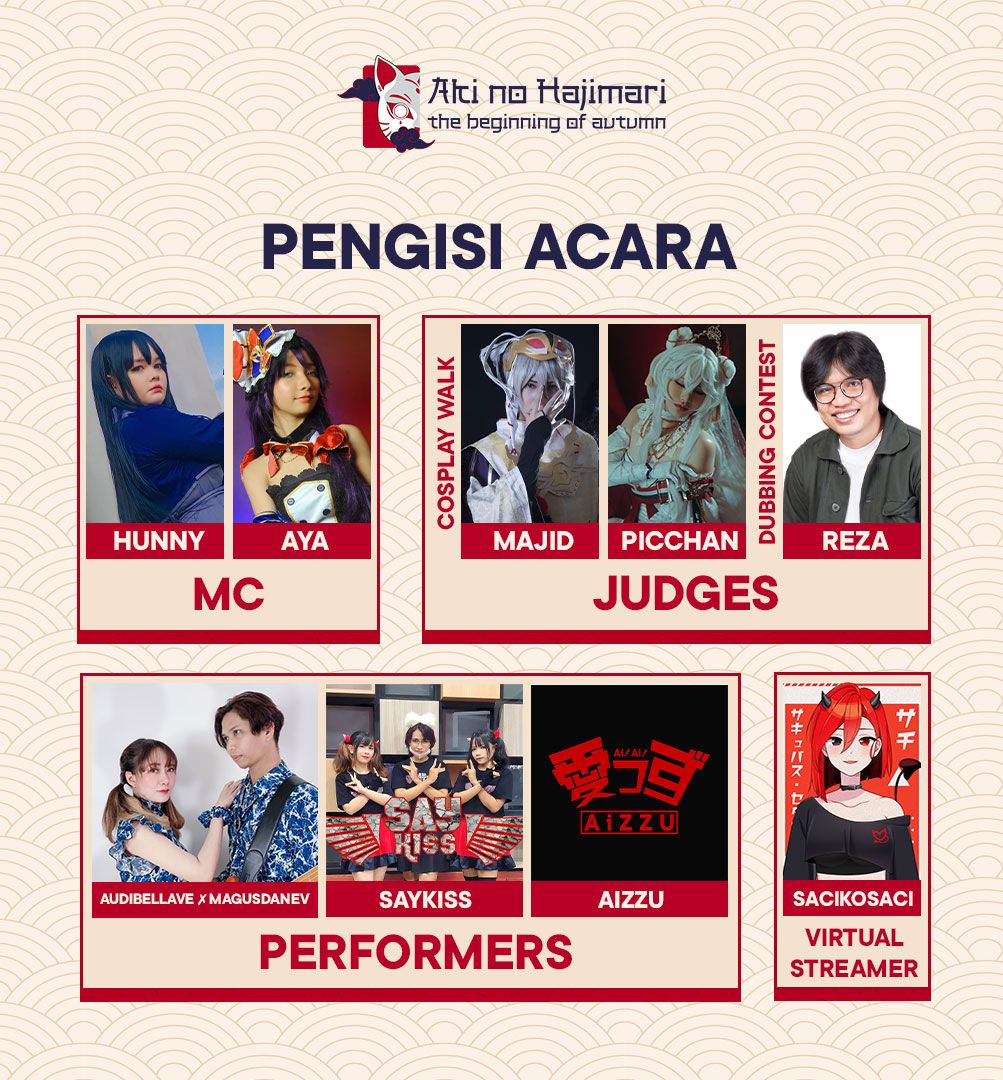 Tidak hanya itu, Aki no Hajimari juga akan menghadirkan pengisi acara yang terkenal di kalangan penggemar Jepang di Kalimantan Selatan, seperti Achan Aya dan Hunny sebagai MC, Reza F. Shaoran sebagai juri Dubbing Competition, Audibellave x Magusdanev sebagai Singing Performer, Saykiss sebagai BABYMETAL Dance Cover, AiZZU sebagai Japanese Traditional Dancer, Majid Vincent dan Picchan sebagai Guest Star serta Juri Cosplay Walk dan Host Tsundere Contest, dan Sacikosaci sebagai Guest Star yang akan melakukan Virtual Talk Show Q&A.