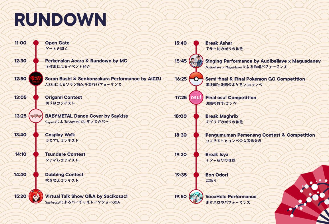 Acara ini akan menampilkan berbagai aktivitas menarik seperti Bazaar Kuliner Jepang dan Merchandise, Photo Booth, Diversity Wall & Tanabata, Performance dari Guest Stars, dan masih banyak lagi. Para pengunjung juga dapat ikut serta dalam berbagai kontes menarik, seperti Cosplay Walk, Tsundere Contest, Fanart Contest, Origami Contest, Dubbing Contest, Pokemon GO Competition, dan osu! Competition.