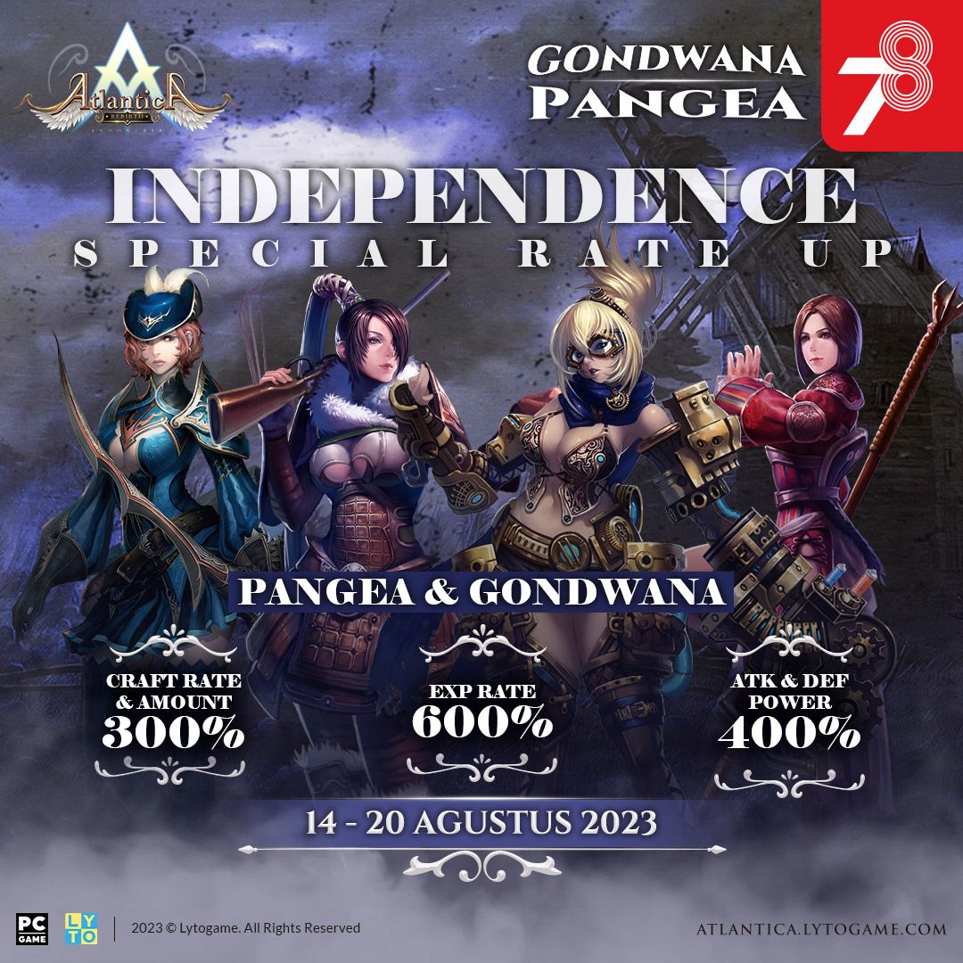 Guna menemani petualangan para Atlantian di Minggu kemerdekaan, tim Atlantica Rebirth Indonesia juga telah menyiapkan event untuk mempercepat progress karakter. Selama periode event Independence Special Rate Up berlangsung, Atlantian di server Pangea dan Gondwana akan mendapatkan buff rate-up, yaitu:
