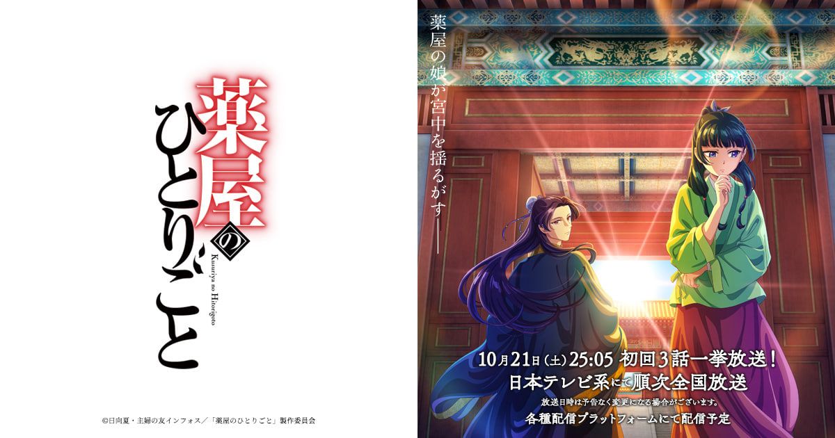 Apothecary Diaries sebagaimana telah diberitakan sebelumnya akan diadaptasi menjadi anime! TOHO Animation dan OLM akan berkolaborasi untuk mengadaptasi komik tentang “obat-obatan” ini menjadi anime. Kini diumumkanlah bahwa anime ini ditayangkan sebanyak 2 cour, di mana 3 episode pertamanya akan ditayangkan mulai 21 Oktober 2023.