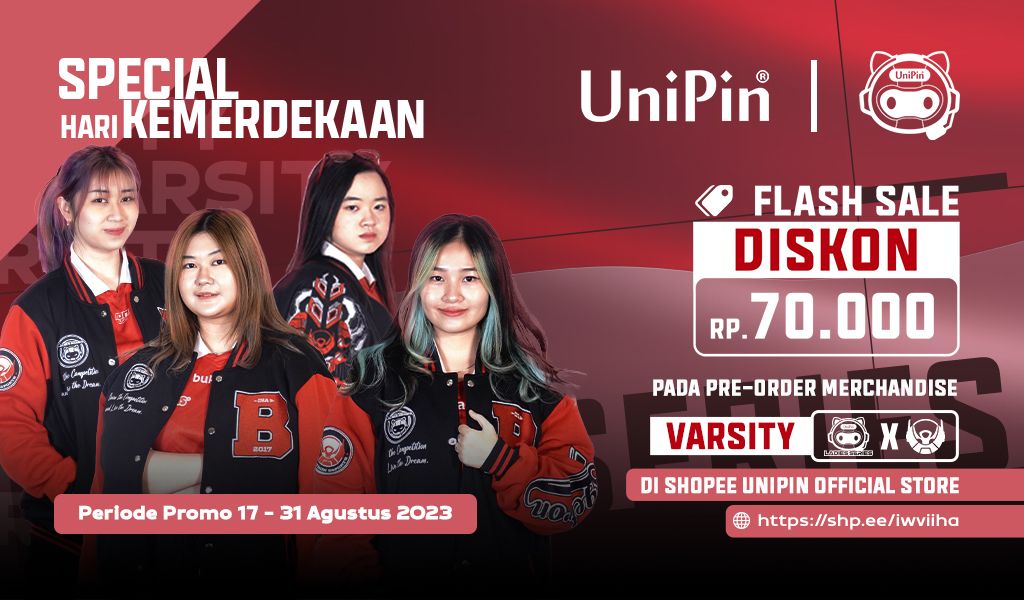 Pada masa pre-order, merchandise dijual seharga Rp550.000. Namun, khusus periode perayaan kemerdekaan pada 17-31 Agustus 2023, ada diskon sebesar Rp70.000 sehingga harga varsity kolaborasi eksklusif ini dapat dibeli dengan harga Rp467.500. Merchandise ini bisa didapatkan di akun Shopee resmi UniPin Official Store.