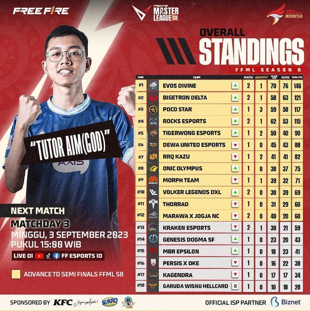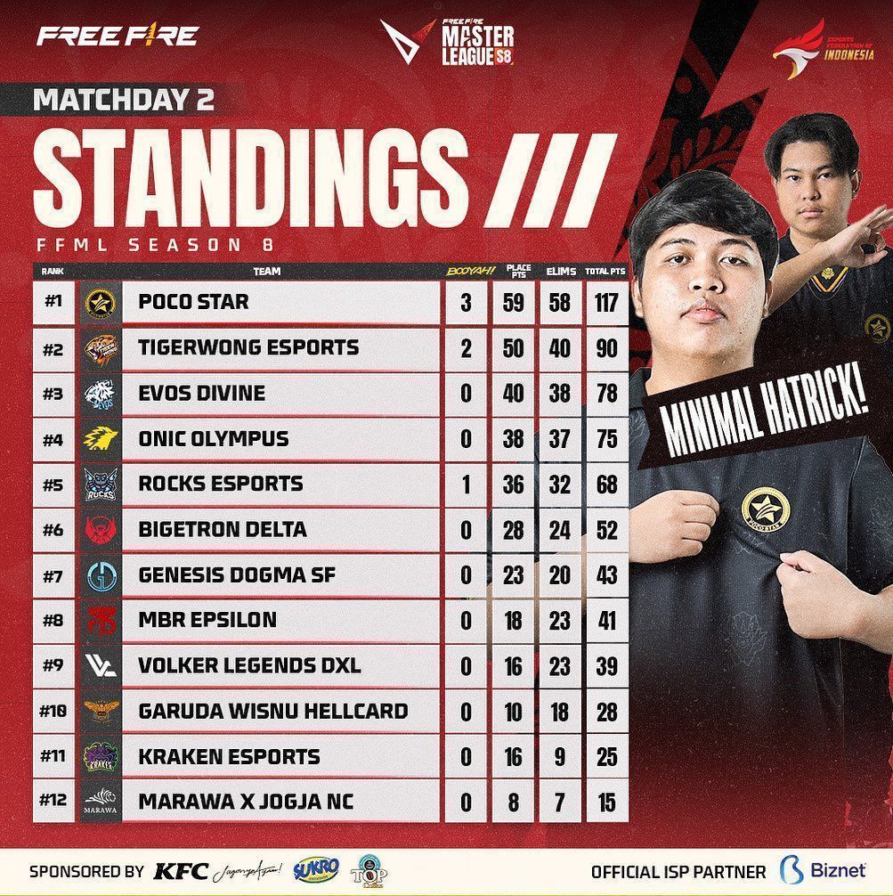 Walaupun POCO Star yang mendapat 3x Booyah! dan Tiger Wong Esports mendapatkan 2x Booyah! pada matchday 2 di minggu pertama FFML Season 8 ini, hasil klasemen sementara malah diraih oleh EVOS Divine dengan perolehan point sebanyak 146 point, sedangkan POCO Star berada di posisi ketiga dengan perolehan point sebanyak 117 point dan Tiger Wong Esports berada di posisi kelima dengan total 90 point.