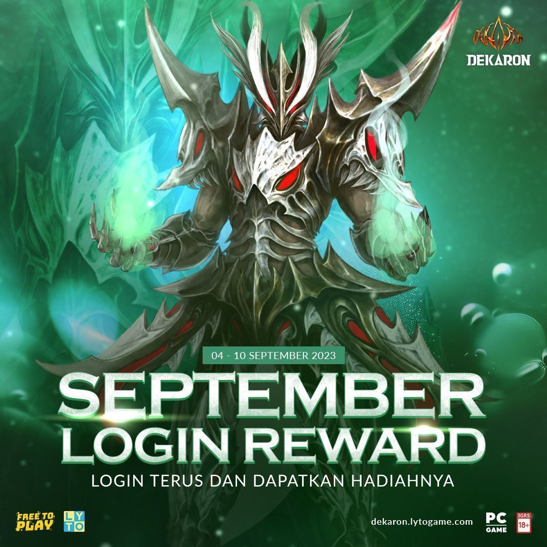 - Hadiah Login September (4-10 September 2023) dalam event Hadiah Login September, para Dekaron yang melakukan login ke dalam game selama total 20 jam selama periode event akan mendapatkan hadiah tanpa diundi. Hadiah tersebut berupa: