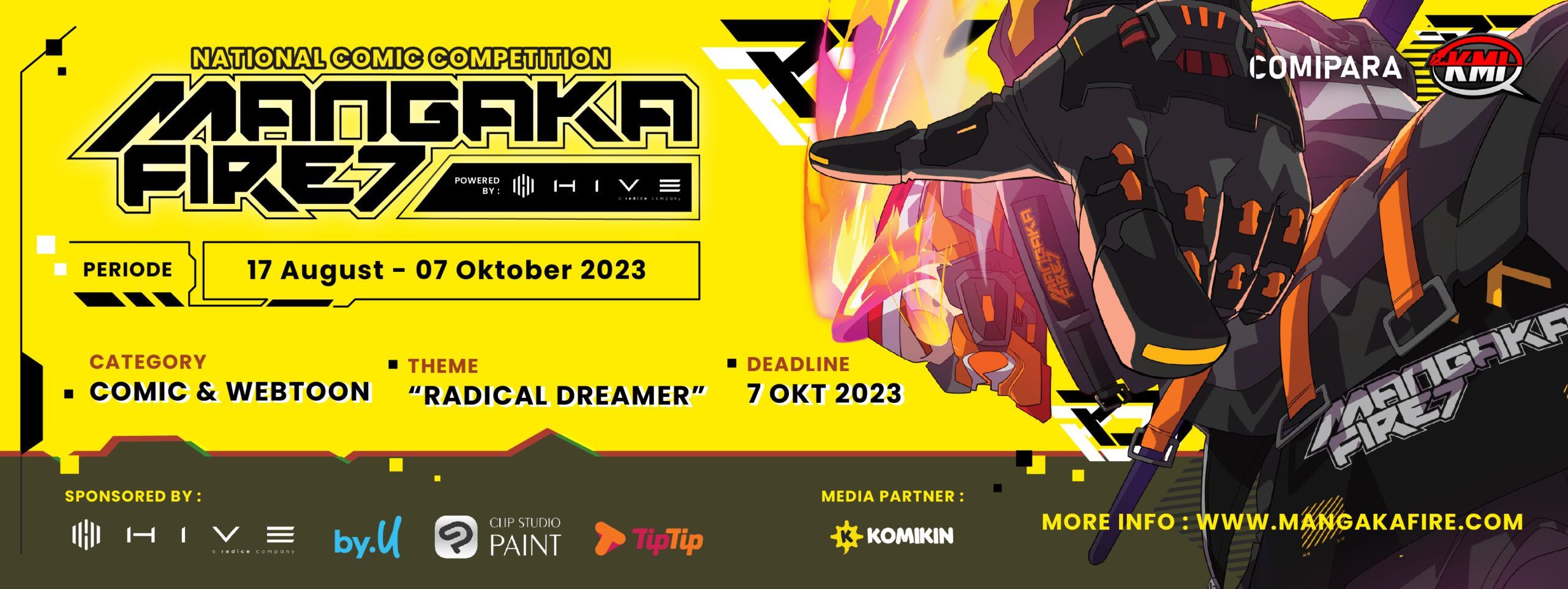 Perkembangan industri kreatif komik di Indonesia semakin tak terbendung, dengan ribuan karya dari para komikus di seluruh negeri yang terbit setiap harinya. Salah satu pendorong lahirnya karya komik terbaik di Indonesia adalah platform komik online Koomik dan KMI (Komunitas Mangaka Indonesia) yang masih terus aktif mendukung para komikus tanah air. Melihat besarnya potensi para komikus dalam negeri, Koomik dan KMI kembali mempersembahkan lomba komik terbaik bertajuk Mangaka Fire 7.