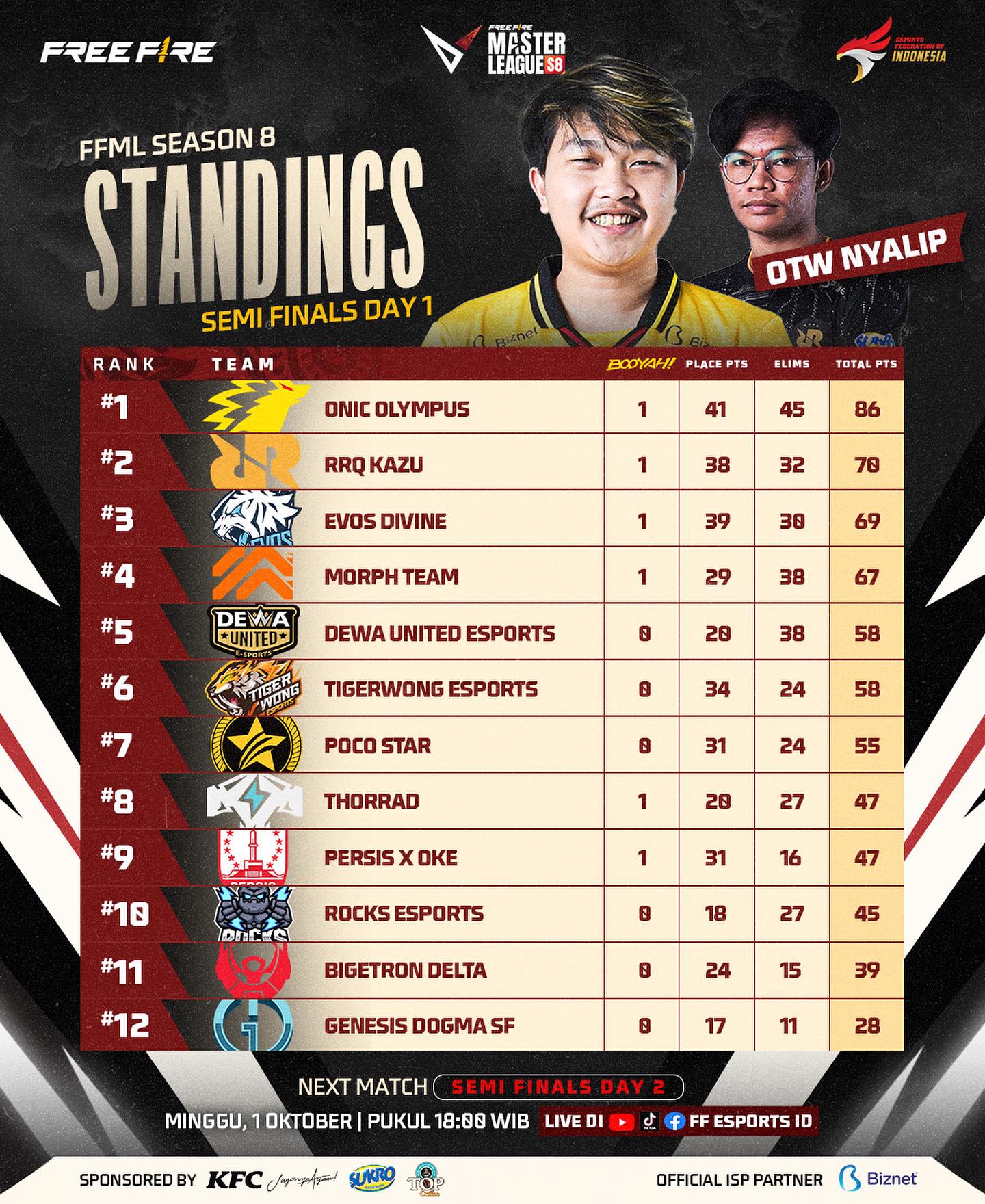 Adapun 12 tim yang akan bertanding di fase Semi-Final dan Grand Final FFML Season 8 berdasarkan urutan klasemen akhir di fase liga adalah POCO Star, RRQ Kazu, Tigerwong Esports (TWE), Thorrad, ONIC Olympus, EVOS Divine, Dewa United Esports, Morph Team, Bigetron Delta, Genesis Dogma, Persis x Oke, dan Rock Esports. Para tim yang bakal bertanding di semi-final bakal mengincar trio “tim kuning” yang mendominasi fase liga, yaitu POCO Star, RRQ Kazu, dan TWE. Sementara itu, tim Persis x Oke berhasil meneruskan tradisi tim pendatang baru yang berhasil lolos ke fase utama FFML Season 8. Sesengit apakah persaingan di hari pertama partai Semi-Final ini?