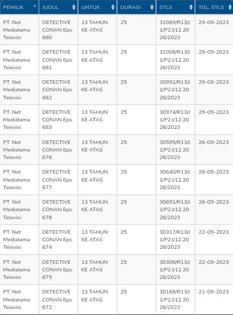 Detektif Conan saat ini tengah ditayangkan secara rutin di stasiun televisi NET. Anime ini saat ini ditayangkan setiap hari Sabtu dan Minggu, pada pukul 06.30 WIB. Sebelumnya sempat dilaporkan bahwa NET baru saja memiliki sejumlah episode terbaru yang belum pernah ditayangkan, yakni episode 667 hingga 669, atau dalam episode asli Jepangnya adalah episode 616-618. Kini melalui data Lembaga Sensor Film (LSF), terungkap NET telah resmi mendaftarkan episode Detektif Conan dari 667 hingga 692, atau dalam episode asli Jepangnya adalah episode 616-641 dengan status lulus sensor per-tanggal 5 Oktober 2023. Episode-episode baru tersebut telah siap untuk ditayangkan oleh NET sewaktu-waktu. Meskipun begitu, masih belum ada kelanjutan informasi lebih lanjut akan hal ini. NET sebelumnya juga sempat menayangkan 5 judul film layar lebar Conan.