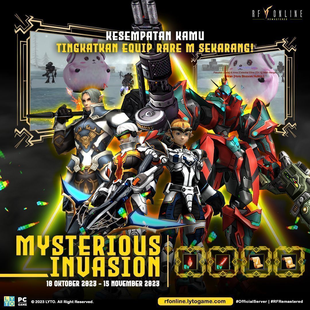 Dalam rangka membuat karakter kesayangan Patriot RF bisa lebih kuat dari sebelumnya dengan lebih mudah, game RF Online Remastered Indonesia mengumumkan update event dengan tajuk Mysterious Invasion yang berjalan pada tanggal 18 Oktober hingga 15 November 2023. Di update event tersebut, Patriot RF bisa mengalahkan Monster Boss yang memiliki drop-item sangat menjanjikan untuk memperkuat karakter kesayangan secara GRATIS! Inilah saat yang tepat untuk kalian memiliki senjata terkuat untuk membela bangsa!