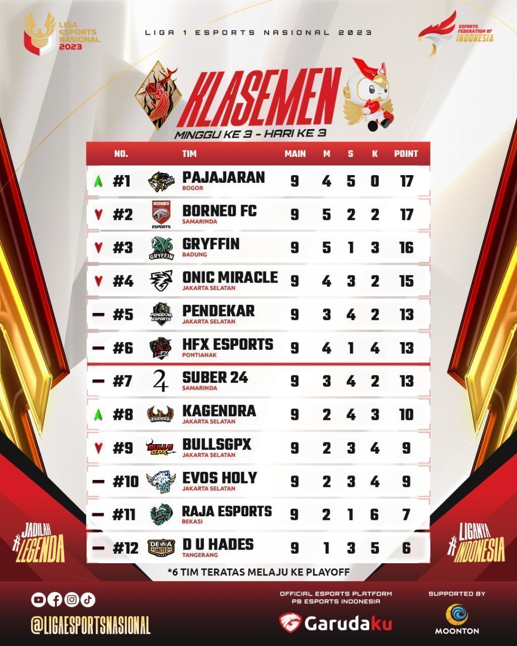 Seri terakhir dari Liga Esports Nasional akan digelar di GOR Universitas Hasanudin Makassar 27-29 Oktober 2023, menyisakan 2 pertandingan, posisi top 6 masih sangat mungkin untuk berubah, mengingat point para tim yang bertanding juga masih sangat mungkin untuk dikejar. 6 tim terbaik akan bermain di babak Playoff yang akan digelar di Jakarta 1-3 Desember 2023.