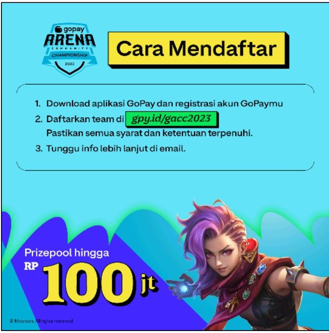 Pendaftaran GoPay Arena Community Championship telah resmi dibuka sejak 1 November hingga 19 November. Bagi gamer yang tertarik untuk mendaftarkan timnya, dapat melihat informasi selengkapnya melalui link gpy.id/gacc2023.