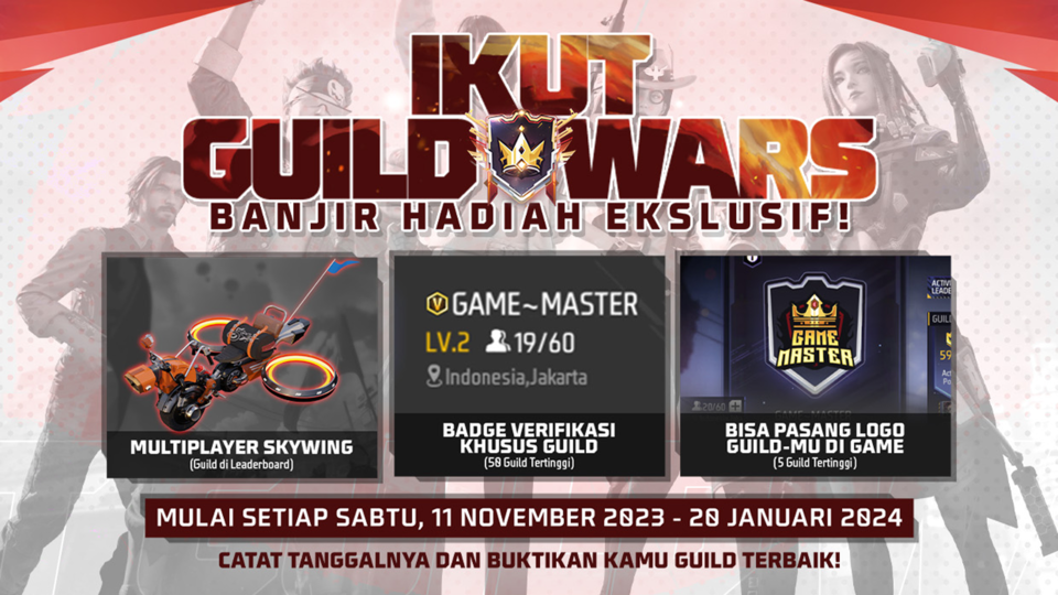 Guild War adalah fitur turnamen Battle Royale antar Guild untuk bersaing menjadi yang terbaik di FF. Tidak hanya bisa mendapatkan title eksklusif Guild Honor, fitur ini akan memberi banyak hadiah eksklusif bagi pemain dan guild yang aktif berpartisipasi. Tak hanya itu, fitur kompetitif ini akan menjadi salah satu jalur kualifikasi menuju panggung FF Nusantara Series (FFNS) #2 yang akan datang.