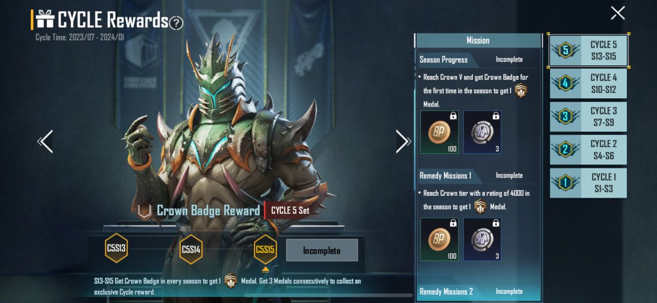 Jika sudah berhasil menyelesaikan tantangan Diamond, maka tahap selanjutnya adalah melangkah ke Crown. Dapatkan skin Mythic CYCLE 5 Set dengan mengoleksi Crown Medal yang didapat dari C5S13, C5S14, dan C5S15.