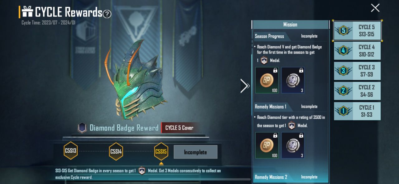 Dalam CYCLE 5 ini, para pemain harus memulai tantangan di C5S15 dengan lebih serius. Pasalnya, ada hadiah eksklusif akan menanti mereka yang bisa mencapai rank Diamond selama 3 musim berturut-turut.
