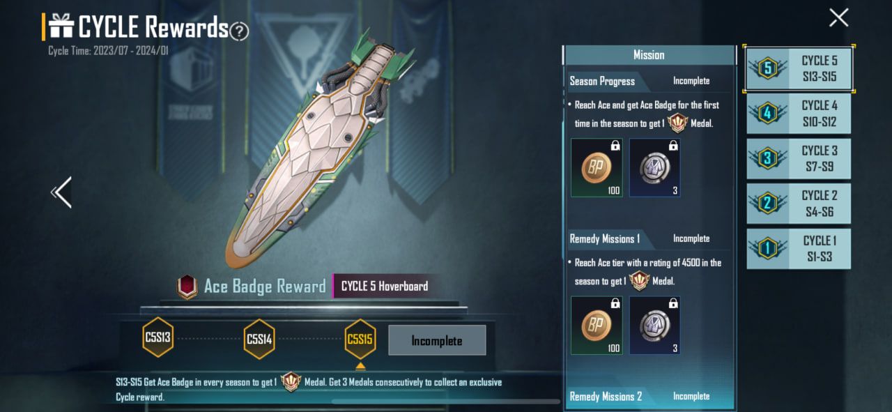 Hanya sedikit pemain PUBG MOBILE di dunia yang bisa mendapatkan hadiah eksklusif CYCLE 5 Hoverboard. Pasalnya, pemain ditantang untuk mencapai rank Ace selama 3 musim berturut-turut pada C5S13, C5S14, dan C5S15, yang tentunya membutuhkan skill dan juga komitmen.