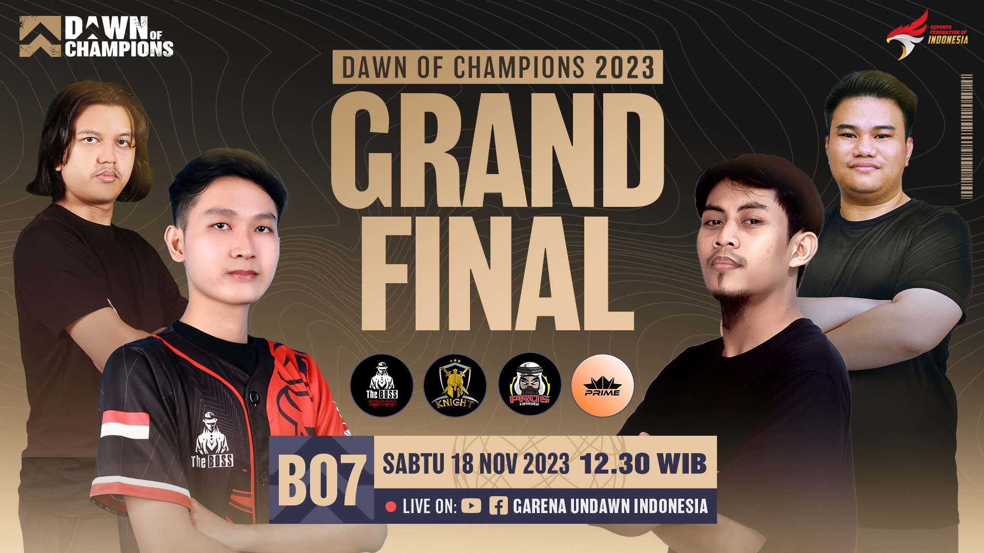 Laga Semi Final dan Grand Final turnamen game Undawn, Dawn of Champions, akan hadir pada Sabtu, 18 November 2023, dengan mempertemukan empat squad dari camp Proshabibi, Knight, The Boss, dan Prime ID. Keempat squad ini berhasil lolos ke babak Semi Final usai melewati perjalanan panjang melawan lebih dari 500 squad lainnya yang berpartisipasi di Dawn of Champions.
