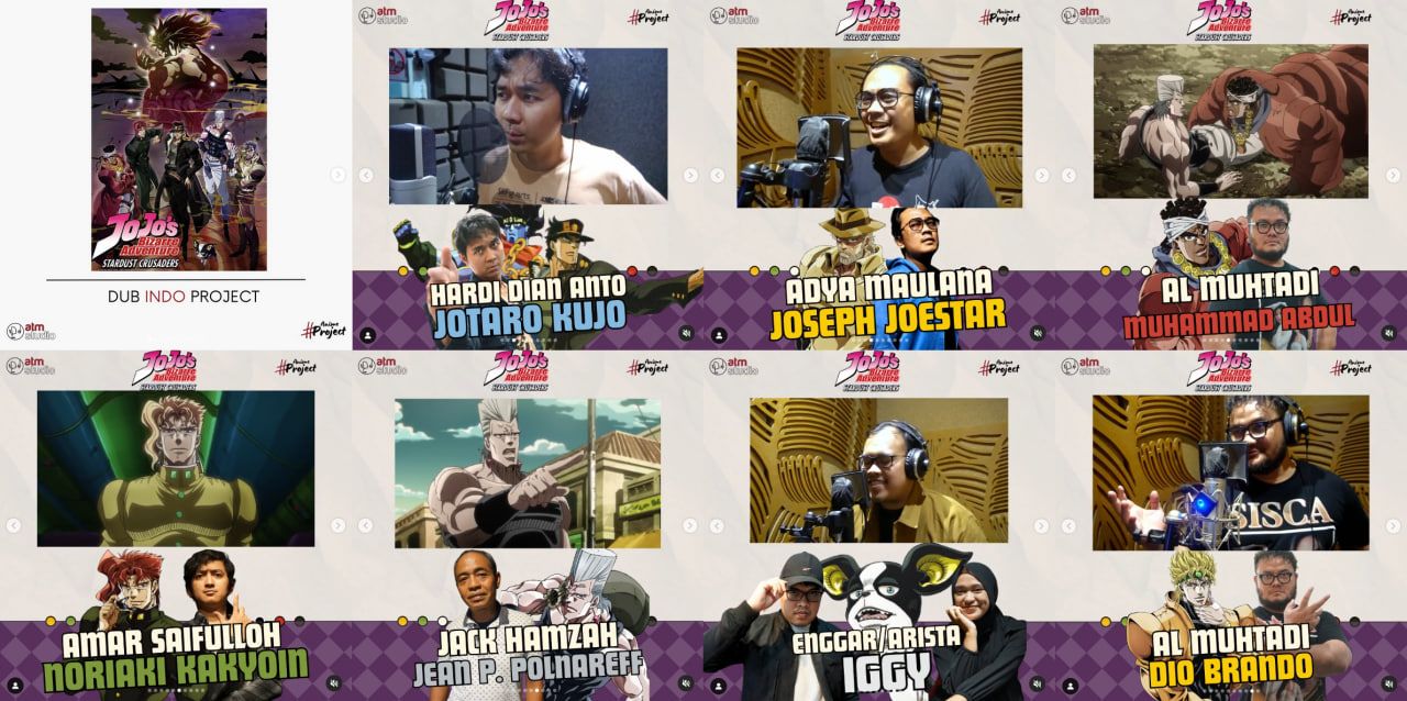 Musim pertama dan kedua dari anime JoJo’s Bizarre Adventure, yakni Phantom Blood dan Battle Tendency kini telah hadir dalam dubbing berbahasa Indonesia. Dubbing bahasa Indonesia ini digarap oleh ATM Studio yang sudah bisa menggarap dubbing untuk anime-anime dari Muse Indonesia. Kini musim ketiga yakni Stardust Crusaders juga sudah tersedia dubbing Indonesianya. Intip sesi dubbingnya berikut ini: