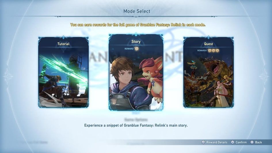Demo Granblue Fantasy: Relink hadir dengan berbagai konten menarik yang dapat dinikmati oleh para pemain. Pertama, terdapat mode Cerita yang memungkinkan pemain untuk memainkan sebagian cerita yang ada. Menyelesaikan mode ini akan memberikan hadiah yang dapat diklaim dalam versi penuh Granblue Fantasy: Relink.