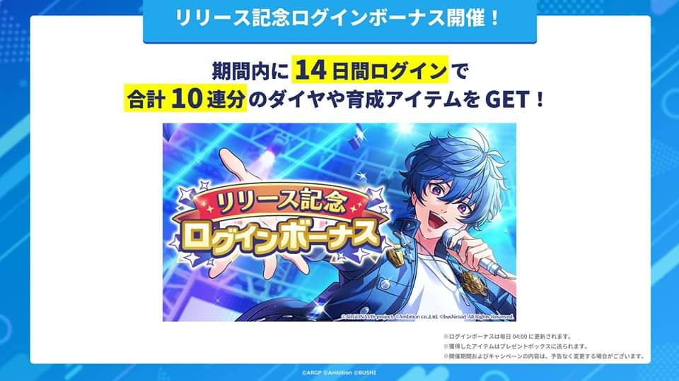 Selain itu, pemain yang login sebanyak 14 hari selama periode promosi perilisan akan mendapatkan 3.000 diamonds (setara 10 kali gacha) dan item untuk memperkuat kartu.