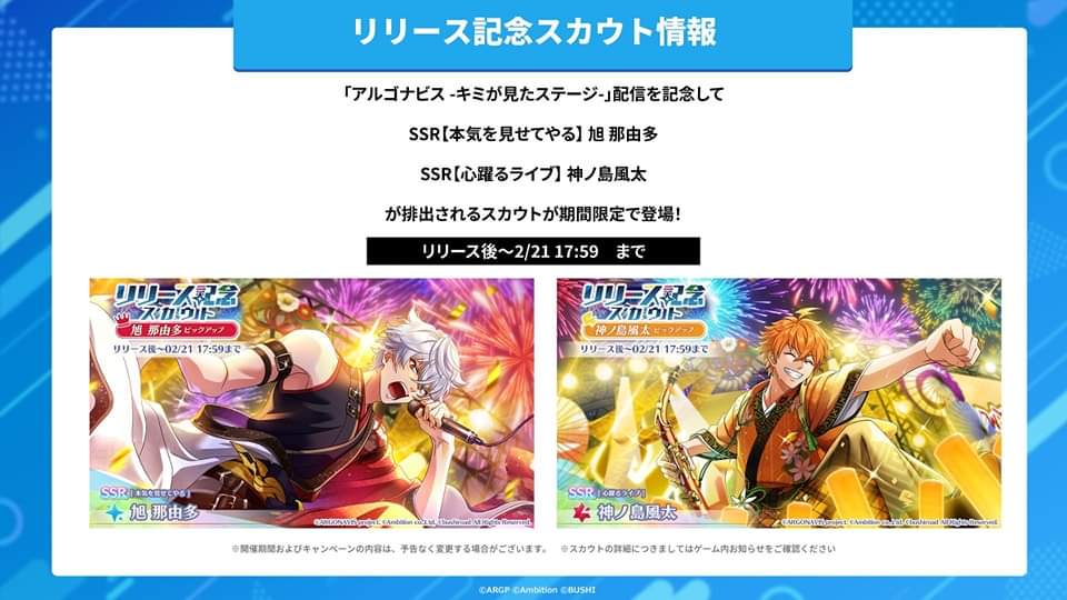 Gim ini juga mengumumkan banner pertamanya yang akan memuat kartu SSR dari karakter Nayuta Asahi dari GYROAXIA dan Fuuta Kaminoshima dari Fujin RIZING!. Kedua kartu ini bisa didapatkan melalui gacha dari tanggal rilis hingga 21 Februari 17:59 JST.