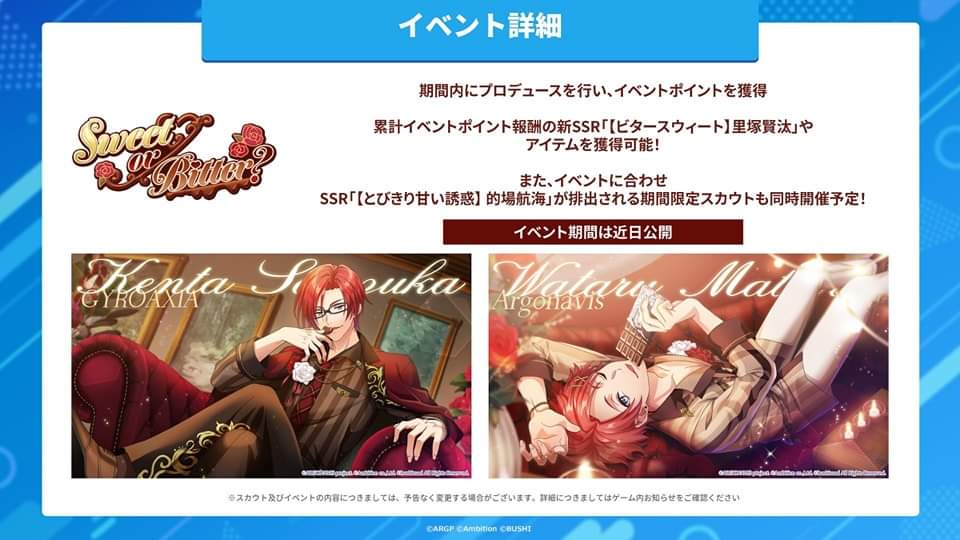 Tanggal perilisan gim terbaru proyek Argonavis, band 2.5D di bawah naungan Bushiroad ini akhirnya diumumkan! Melalui siaran langsung di kanal Youtube @ARGONAVISch, diumumkan bahwa gim yang dikembangkan oleh Ambition Co. Ltd. ini berjudul “Argonavis ~Kimi ga Mita Suteji e~“ (Kimisute), dan akan dirilis pada 7 Februari mendatang. Dari video promosi yang sudah dirilis sebelumnya, game ini bertajuk idol raising simulator, di mana pemain dapat mengumpulkan kartu karakter dan melatihnya hingga mencapai stat maksimal. Saat ini, pemain juga sudah dapat melakukan pra-pendaftaran di PlayStore dan Appstore.