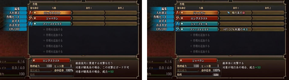 Taktik dapat memiliki prioritas yang berbeda. Karakter akan menggunakan keahlian tertinggi dalam Daftar Prioritas mereka dengan kondisi yang telah terpenuhi, jadi pastikan memberi prioritas pada sihir penyembuhan atau keahlian vital lainnya.