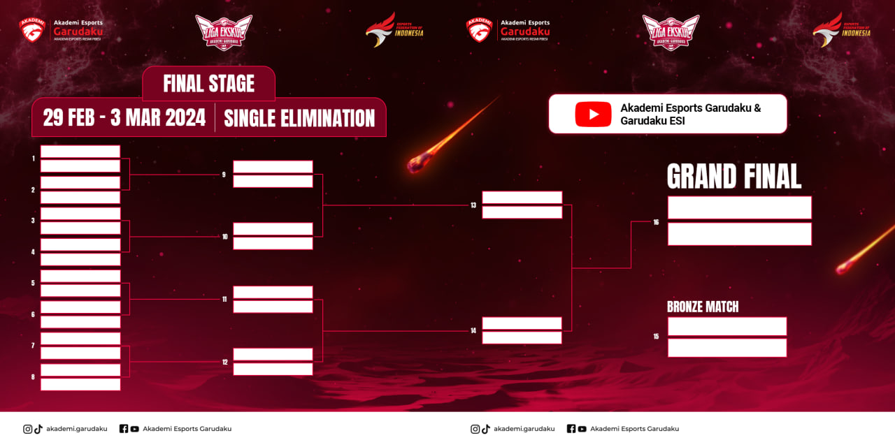 Liga Ekskul Akademi Garudaku sendiri akan berlangsung pada 16 Februari – 3 Maret 2024 dengan skema pertandingan Group Stage untuk mencari top 2 dari 8 group dengan sistem round robin dilanjutkan dengan fase Final Stage dengan sistem single elimination. Total prize pool untuk Liga Ekskul Akademi Garudaku adalah Rp 12.000.000.