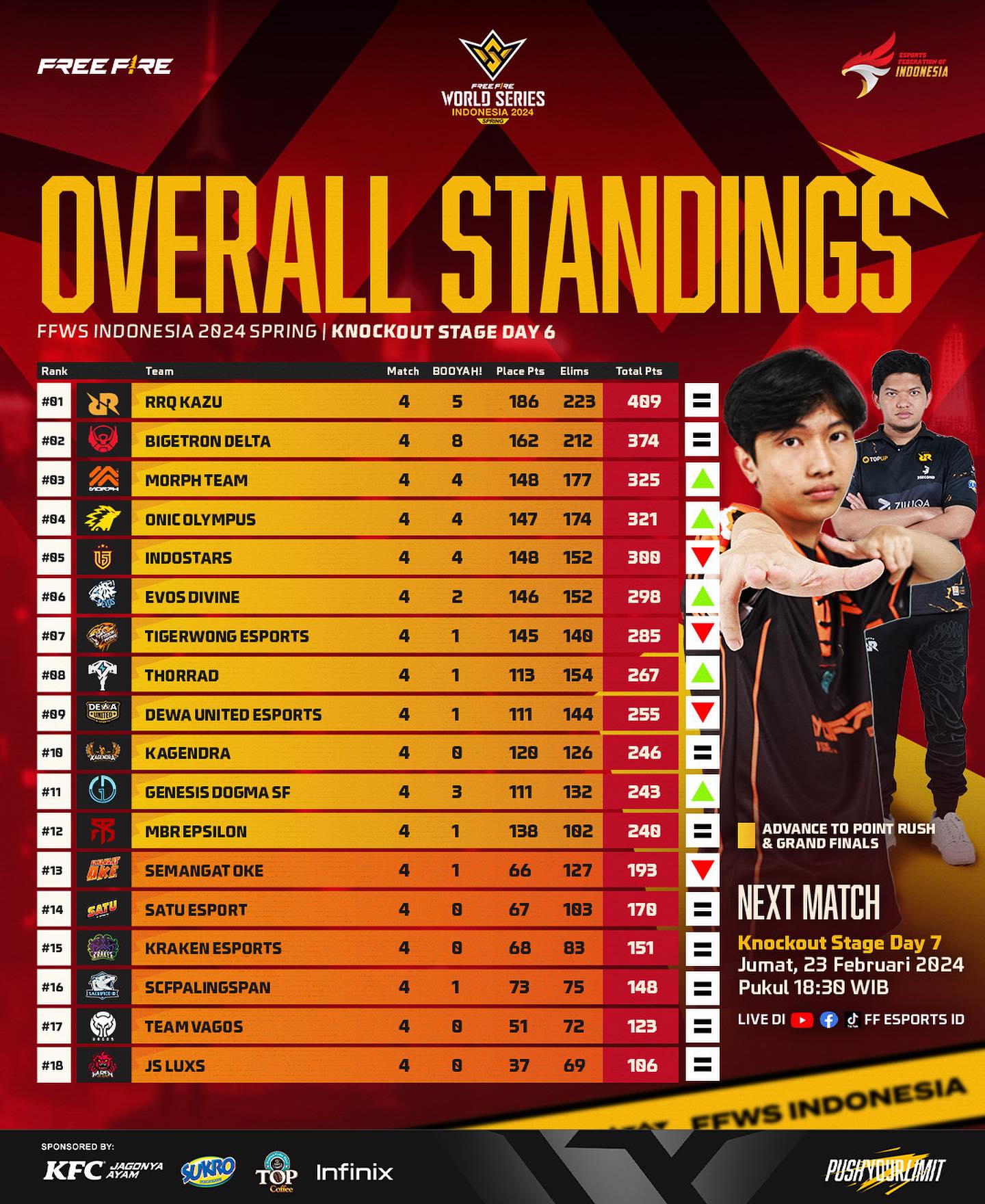 Pada akhirnya, week kedua Free Fire World Series Indonesia 2024 Spring masih milik RRQ Kazu yang meraih total point sebanyak 409 poin. Sementara itu Bigetron Delta yang sebelumnya berada di posisi ketiga klasemen sementara di week 1 akhirnya berhasil naik ke posisi kedua di week 2.