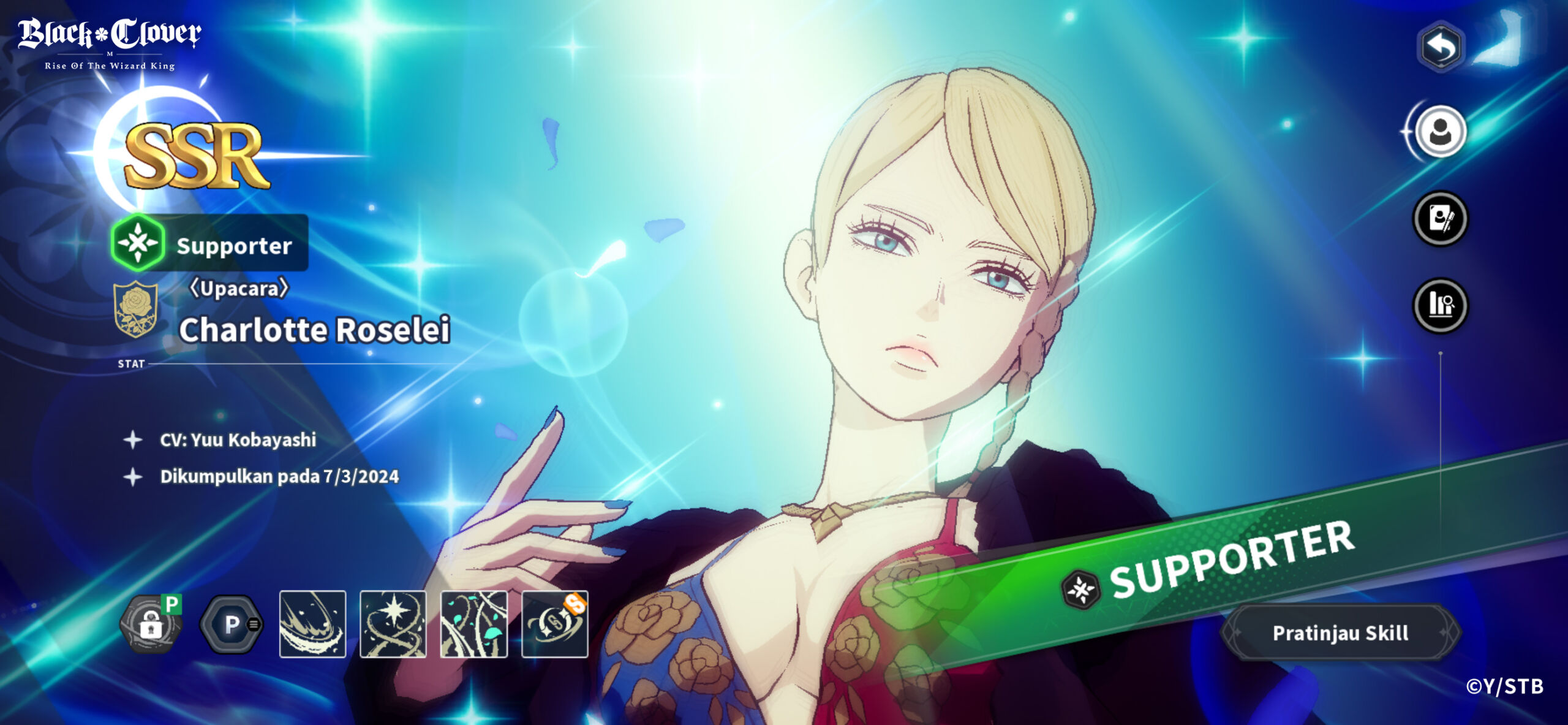 SSR <Upacara> Charlotte adalah karakter Supporter dengan kekuatan unik, seperti memberikan SP kepada rekan dan menambah durasi Barrier. Skill Spesialnya – ‘Blessing of Blue Rose’ memanggil tanaman berduri yang akan memberikan bu kepada semua rekan secara instan. Dengan kehadiran SSR <Upacara> Charlotte di dalam tim akan membuat karakter Attacker kalian lebih sering menggunakan Skill Spesial.