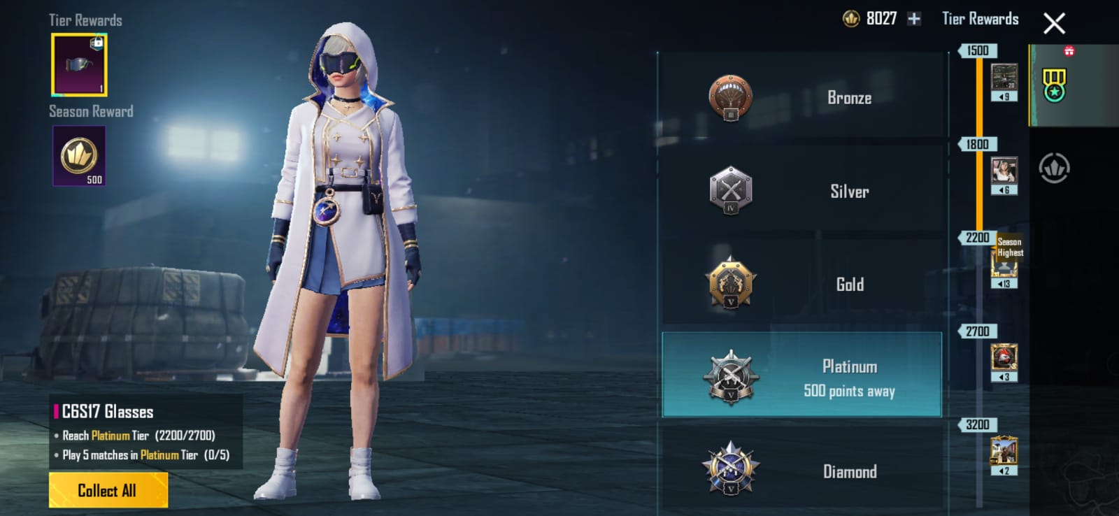 Skin permanen pertama yang dapat pemain klaim secara gratis adalah C6S17 Glasses. Caranya sangat mudah, pemain hanya perlu mencapai minimal rank Platinum dan memainkan minimal 5 permainan pada rank tersebut. Pemain juga akan mendapatkan hadiah tambahan 500 Season Token jika mencapai rank ini.