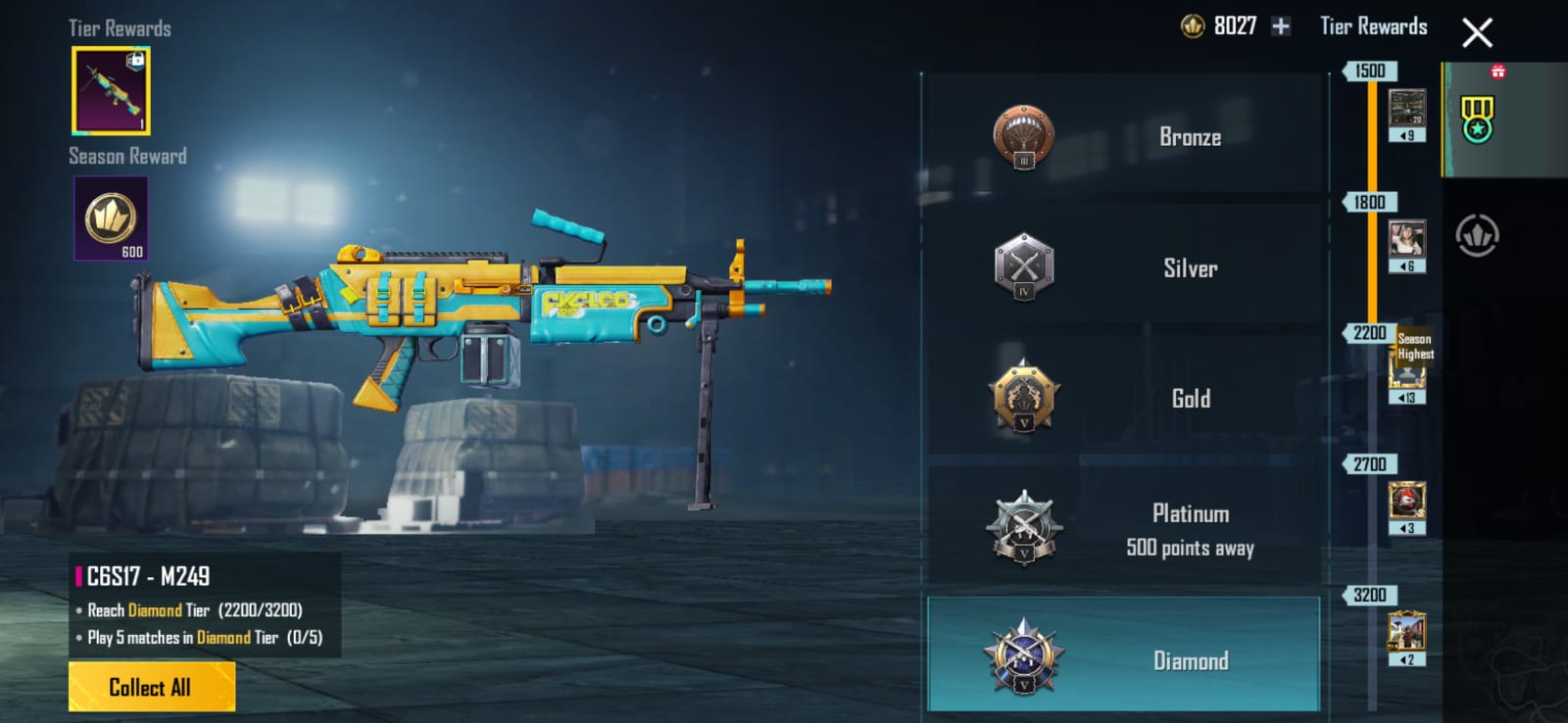Rank Diamond adalah tantangan selanjutnya bagi pemain yang telah lolos dari rank Platinum. Jika pemain berhasil mencapainya, pemain akan mendapatkan skin M249 eksklusif C6S17.