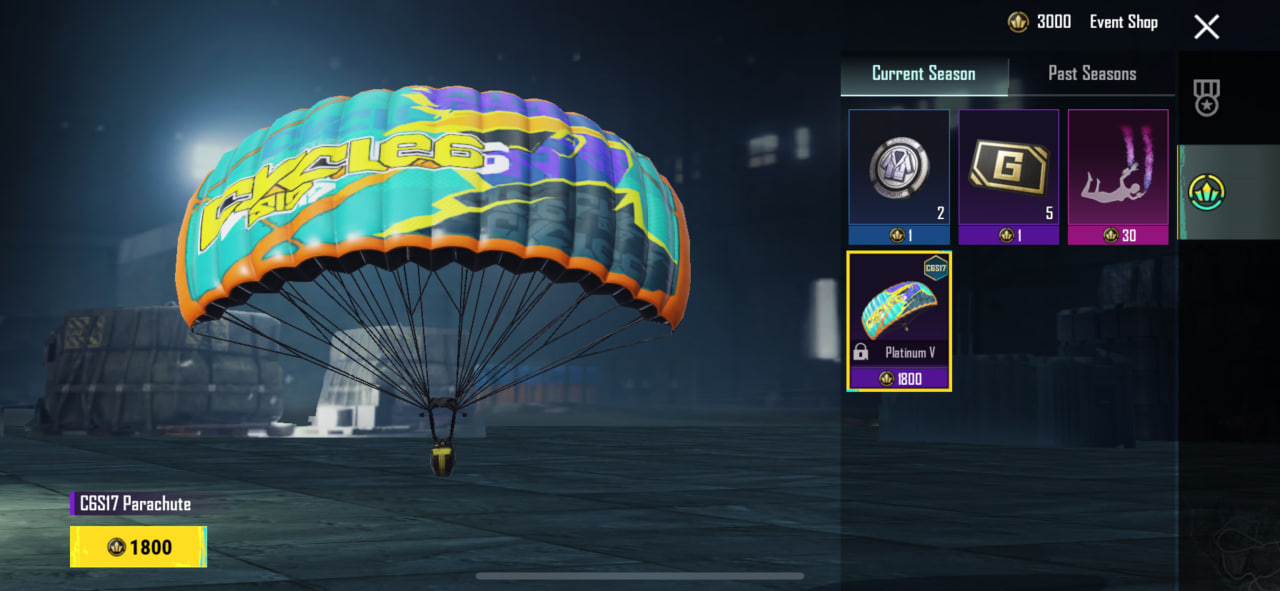 Selain C6S17 Glasses, pemain yang berhasil mencapai minimal rank Platinum V juga dapat mengklaim hadiah berupa C6S17 Parachute. Skin parasut ini tersedia di Event Shop dan bisa diklaim dengan menukarkan 1800 Season Tokens.