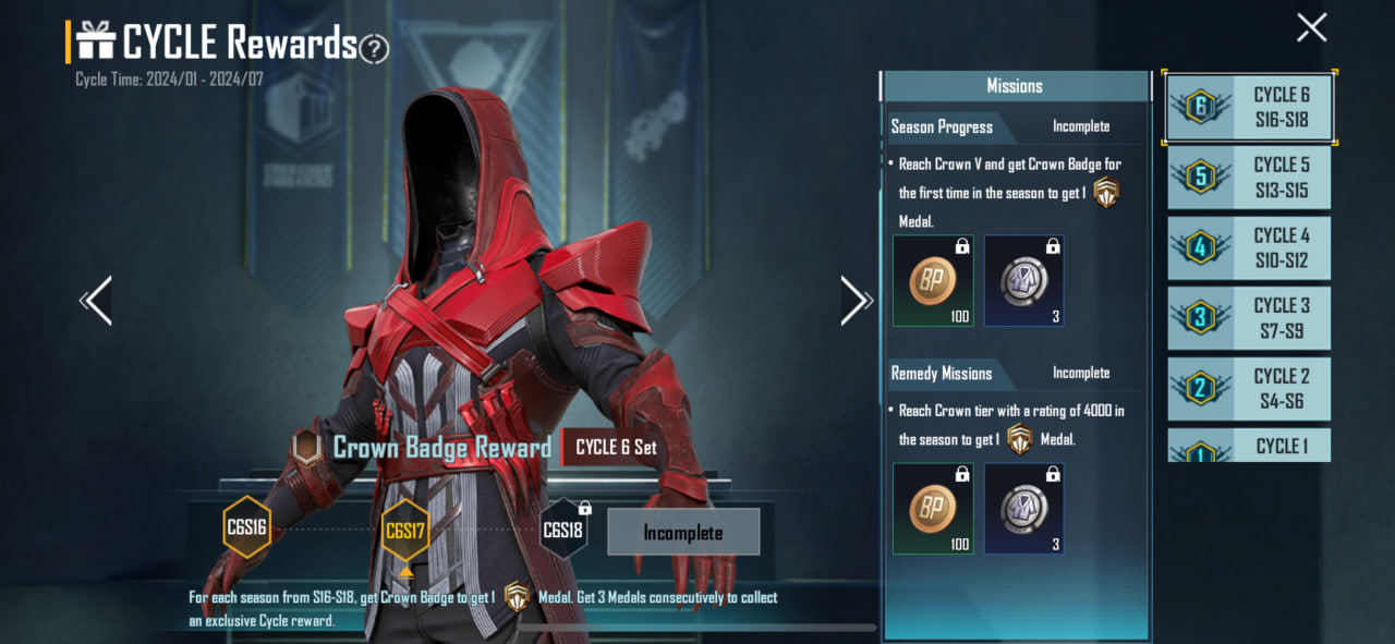 Jika sudah berhasil menyelesaikan tantangan Diamond, maka tahap selanjutnya adalah melangkah ke Crown. Dapatkan skin Mythic CYCLE 6 Set dengan mengoleksi Crown Medal yang didapat dari C6S16, C6S17, dan C6S18.