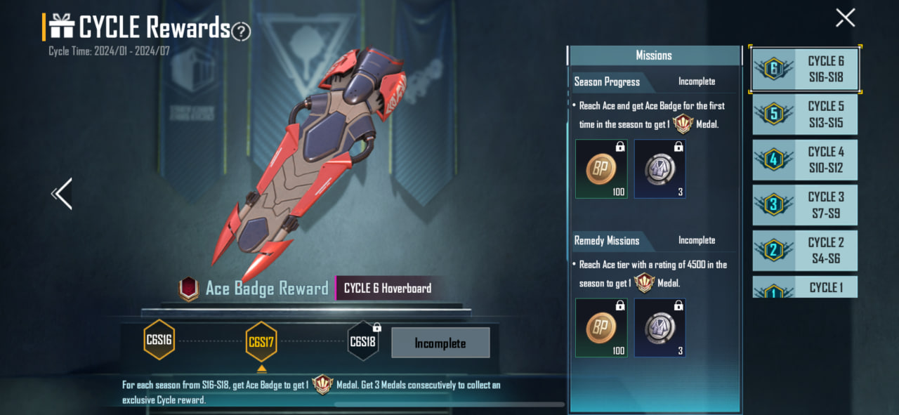 Hanya sedikit pemain PUBG MOBILE di dunia yang bisa mendapatkan hadiah eksklusif CYCLE 6 Hoverboard. Pasalnya, pemain ditantang untuk mencapai rank Ace selama 3 musim berturut-turut pada C6S16, C6S17, dan C6S18, yang tentunya membutuhkan skill dan juga komitmen.