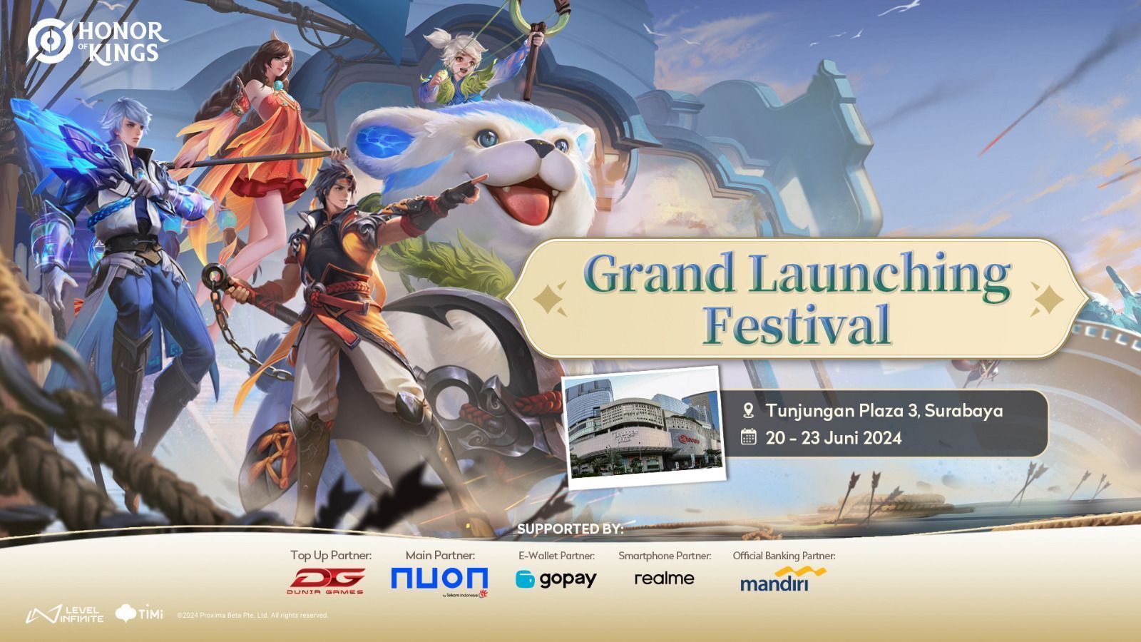 Game bergenre MOBA terbaru besutan TiMi Studio Group dan dirilis secara global oleh Level Infinite yaitu Honor Of Kings (HOK) resmi mengumumkan event peluncuran gamenya di seluruh Indonesia dengan acara utamanya, Honor Of Kings Grand Launching Festival yang berlangsung pada tanggal 20-23 Juni 2024 di Tunjungan Plaza 3, Surabaya.