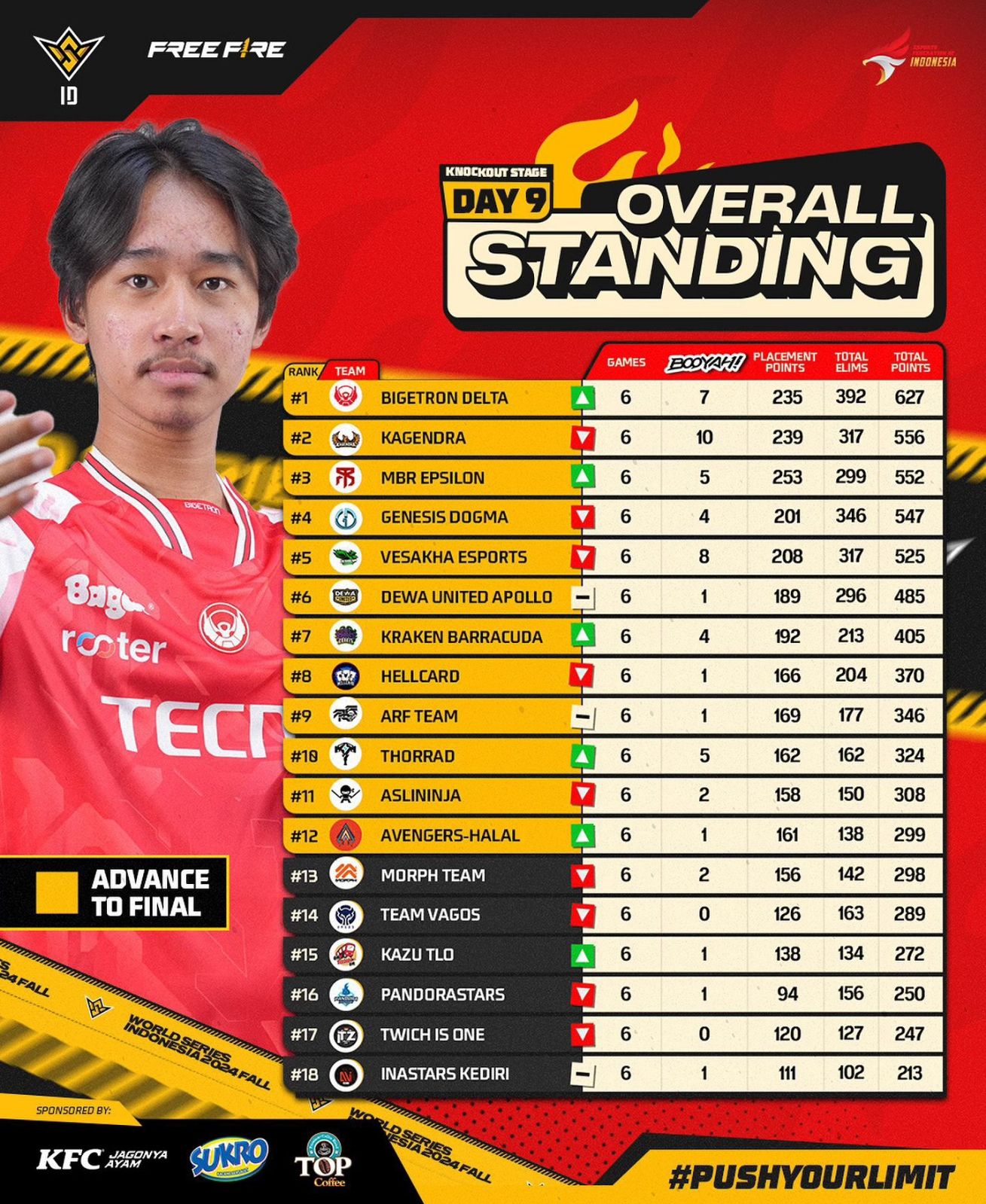 Tim-tim komunitas seperti Hellcard NC (yang nantinya akan berganti nama menjadi Deus Card di babak Grand Final), AsliNinja, dan ARF Team berhasil lolos ke babak berikutnya berkat poin yang mereka raih di week terakhir. Ngomong-ngomong soal tim komunitas, Avengers Halal menjadi tim komunitas yang paling beruntung di musim kali ini dan sukses membuat kejutan dengan lolos ke babak Grand Final dengan di posisi ke-12 dan nyaris terkejar 1 poin dari Morph Team. Sebenarnya Morph Team bisa saja lolos ke babak Grand Final jika pada matchday 9 kemarin mereka tidak melakukan blunder maupun “kepleset” yang menciptakan momentum bagi lawan-lawannya. Karena hal ini, Morph Team akhirnya untuk yang pertama kalinya gagal lolos ke fase final kompetisi utama Free Fire setelah bergabung sejak 2023 lalu.