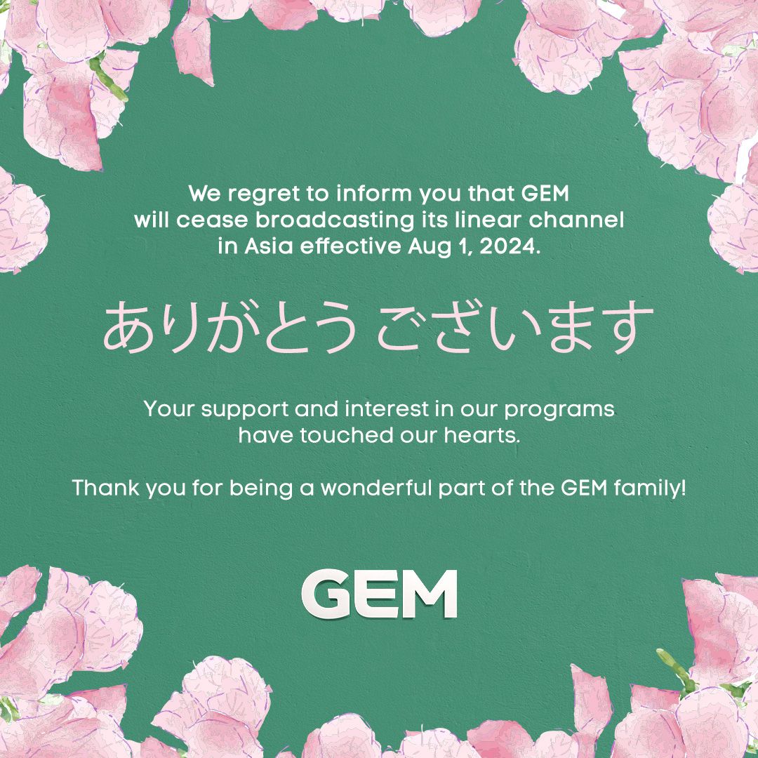 Terima kasih kepada GEM yang telah menghibur para pemirsa dengan berbagai program-program hiburan dari Jepang seperti drama, film, musik, olahraga, budaya, entertainment, dokumenter, dan sebagainya.