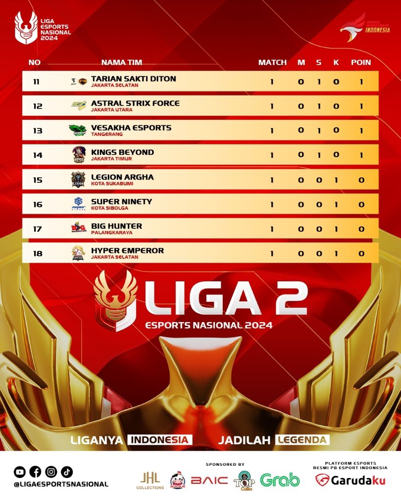 Liga 2 Esports Nasional masih akan berlanjut sampai ditemukan 2 tim teratas yang berhak untuk melangkah maju ke Liga 1 Esports Nasional yang akan digelar secara offline di Mall Taman Anggrek Jakarta Barat tanggal 5-27 Oktober 2024.