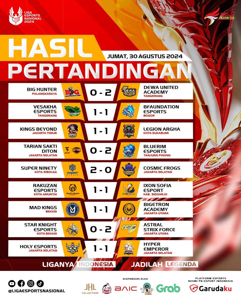 Kings Beyond dari Jakarta Timur juga bertarung sengit melawan Legion Argha dari Kota Sukabumi, namun pertandingan ini juga berakhir imbang 1-1, menunjukkan bahwa kedua tim ini memiliki kemampuan yang seimbang. Di pertandingan keempat, Bluerim Esports dari Tanjung Pinang berhasil meraih kemenangan penting dengan skor 2-0 melawan Tarian Sakti Diton dari Jakarta Selatan sekaligus mengamankan posisi mereka di papan atas.