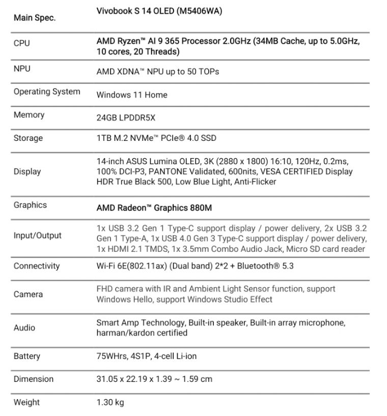 Berikut spesifikasi dari ASUS Vivobook S 14 OLED (M5406WA):