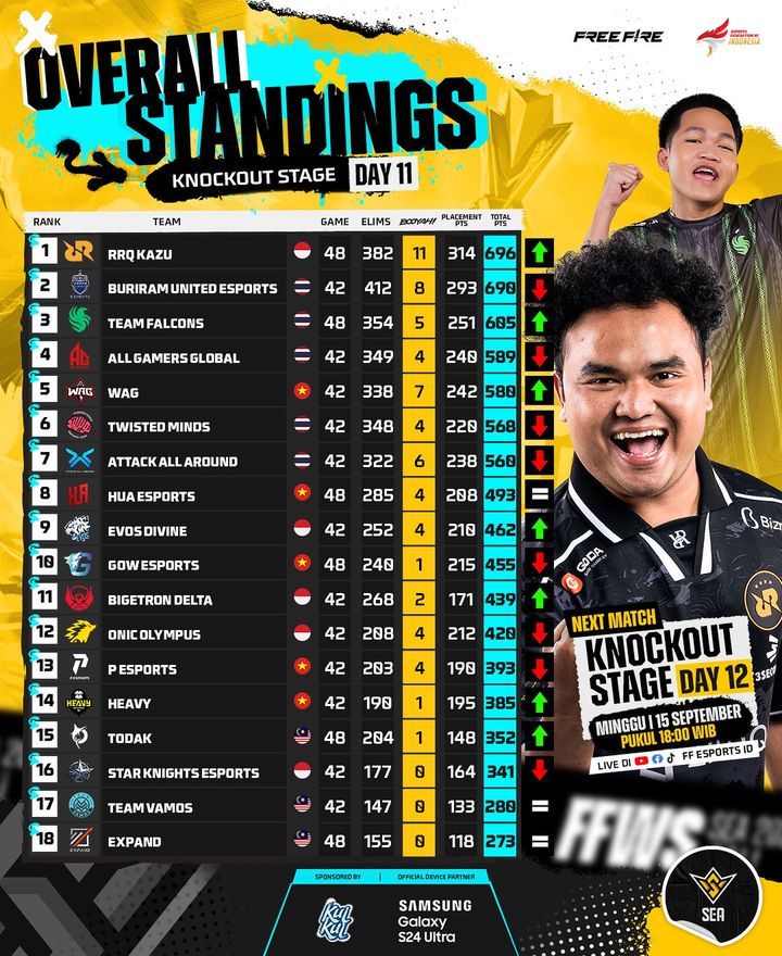 Buriram United Esports lagi-lagi menjadi raja di pekan ke-4 fase knock-out FFWS SEA 2024 Fall dengan mengumpulkan 817 poin di posisi puncak. RRQ Kazu kembali harus mengejar di posisi kedua dengan 690 poin, disusul oleh AG Global yang berselisih tipis di posisi 3 dengan 680 poin. Di posisi 4 dan 5 ada Twisted Minds dan WAG dengan 669 dan 631 poin.