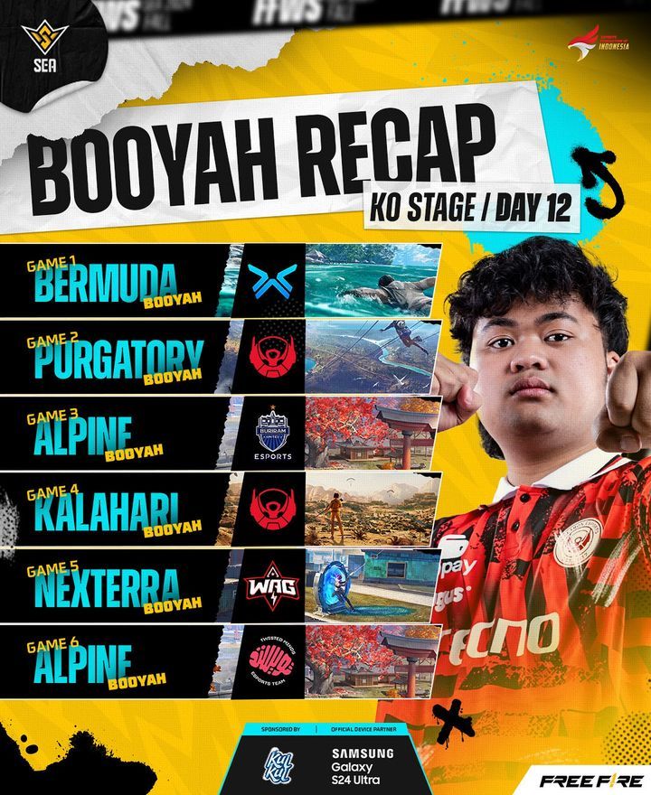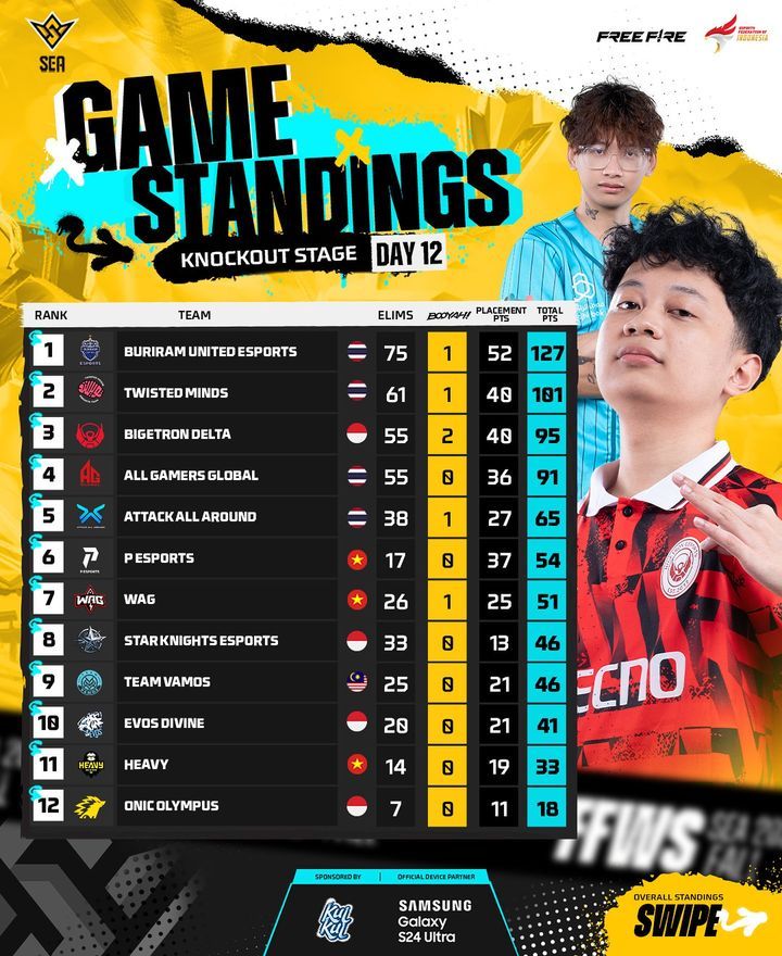 Ketajaman gameplay Bigetron Delta di late-game akhirnya berhasil terasah di matchday 12. Bagaimana tidak, dalam matchday yang dipenuhi oleh tim-tim unggulan Thailand dan Vietnam, sang Robot Merah berhasil bertengger di posisi ketiga dengan 95 poin dan sukses membungkus dua Booyah! di game 2 dan 4. Sayangnya, hal ini tidak diikuti oleh tiga tim Indonesia lain yang bertempur di matchday tersebut. Star Knights Esports, EVOS Divine, dan ONIC Olympus harus puas finish di posisi 8, 10, dan 12 masing-masing dengan mengumpulkan 46, 41, dan 18 poin.
