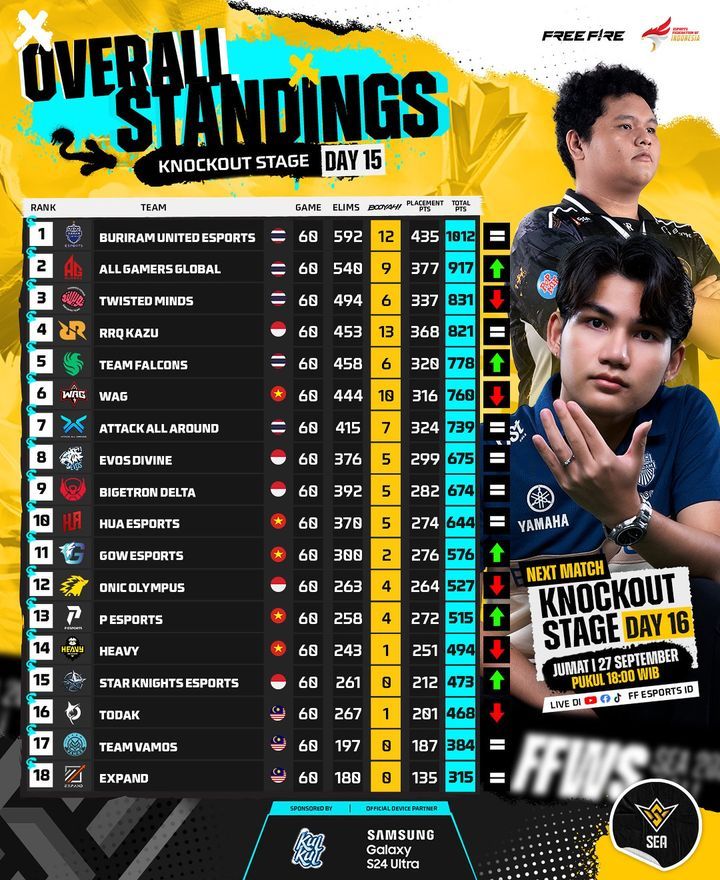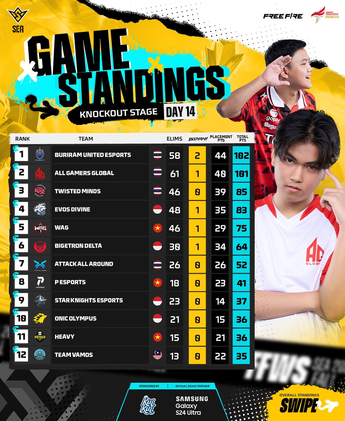 Tampil all-in dengan empat tim, tim-tim Thailand lagi-lagi mendominasi klasemen harian Matchday 15 FFWS SEA 2024 Fall. AG Global tak tanggung-tanggung langsung merebut 4 Booyah! di 4 ronde awal matchday ini dan bertengger di puncak klasemen harian dengan 136 poin. Team Falcons, dan Buriram United Esports menyusul di belakangnya, masing-masing dengan 103 dan 93 poin (serta 1 Booyah!). Team Attack All Around (AAA) tertinggal di belakang di posisi 6 dengan mengumpulkan 62 poin. Tren menguatnya perwakilan Vietnam di musim ini kembali ditunjukkan oleh tim GOW dan Hua Esports yang bertengger di posisi 4 dan 5 klasemen harian.