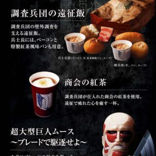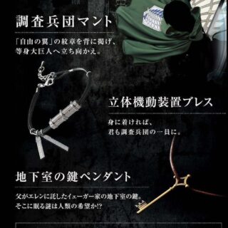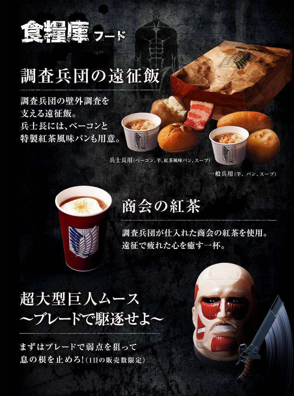 Selain itu Universal Studio juga menyediakan ransum makanan ala para personel Survey Corps seperti bacon, kentang, roti rasa teh hitam, dan sup (untuk komandan), maupun kentang, roti, dan sup (untuk prajurit biasa). Univeersal Studio juga menjual perlengkapan para Survey Corps seperti mantel, gelang berbentuk 3D Maneuver Gear, maupun kunci.