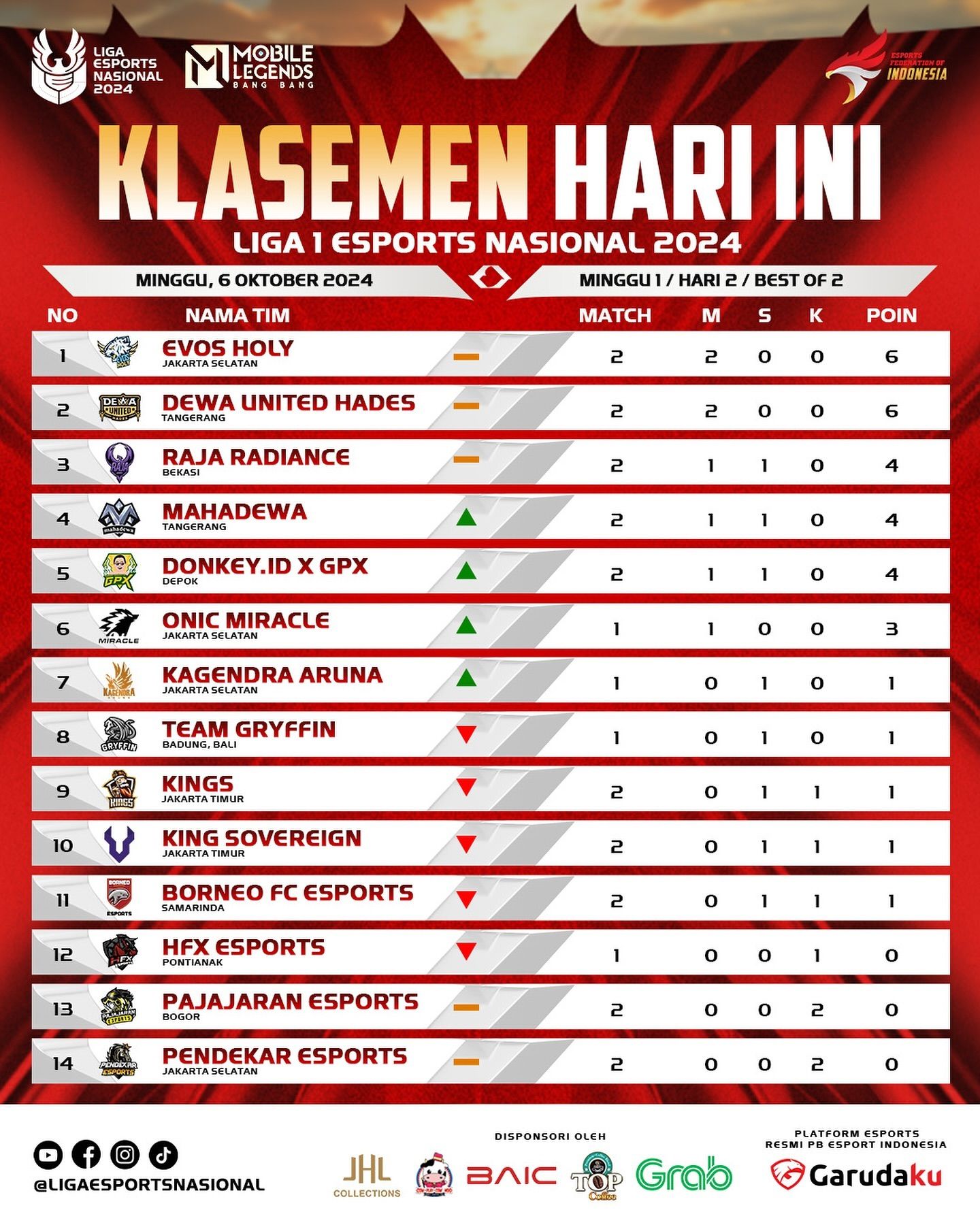 EVOS Holy (Jakarta Selatan) kembali menunjukkan dominasinya di Liga 1 Esports Nasional dengan meraih poin sempurna setelah menaklukkan Kings Sovereign (Jakarta Timur) di laga penutup hari kedua. Dengan kemenangan ini, EVOS Holy semakin mengokohkan posisinya di puncak klasemen sementara Liga 1 Esports Nasional 2024.