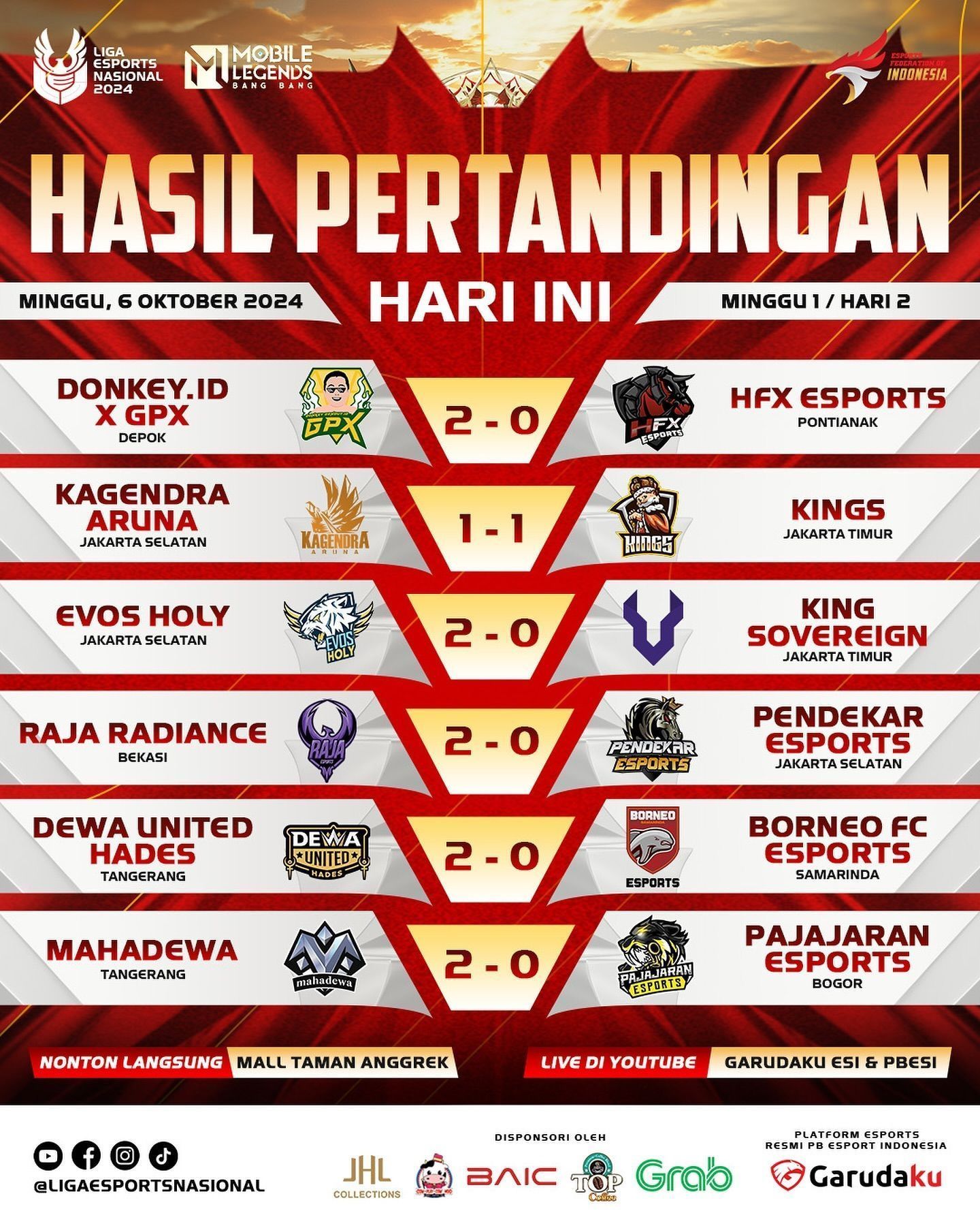 Berikut adalah hasil pertandingan di hari kedua Liga 1 Esports Nasional 2024:
